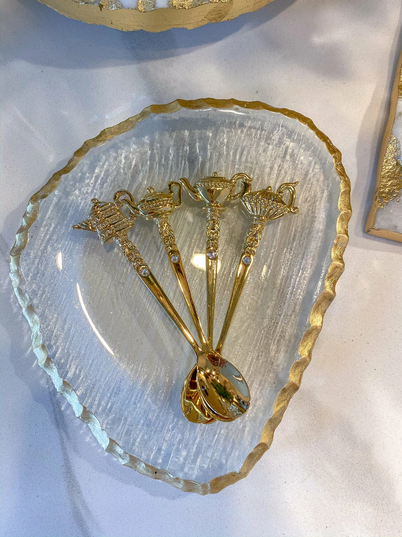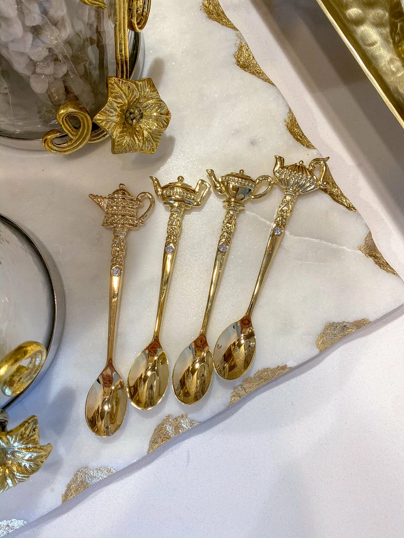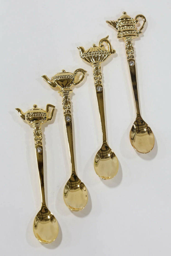 Description: These adorable spoons are perfect for serving your favorite cup of tea! Each has a unqiue teapot design and a small clear crystal, all finished off with an elegant gold finish. Sold as a set of 4!