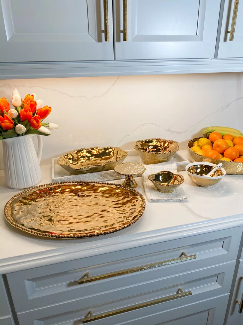 Description: This high quality porcelain is a miracle material! It is food safe, dishwasher safe, and oven safe up to 350 degrees! Made in Argentina, this beautiful porcelain is also tarnish free, scratch/stain resistant, will not lose its beautiful luster, and is perfect for everyday life! Baking and serving never looked so good! This wavy edge beaded salad bow features a beautiful gold shiny finish and is very versatile. Ties back to all of our other beaded porcelain pieces. Comes in 2 sizes, Sold separately.