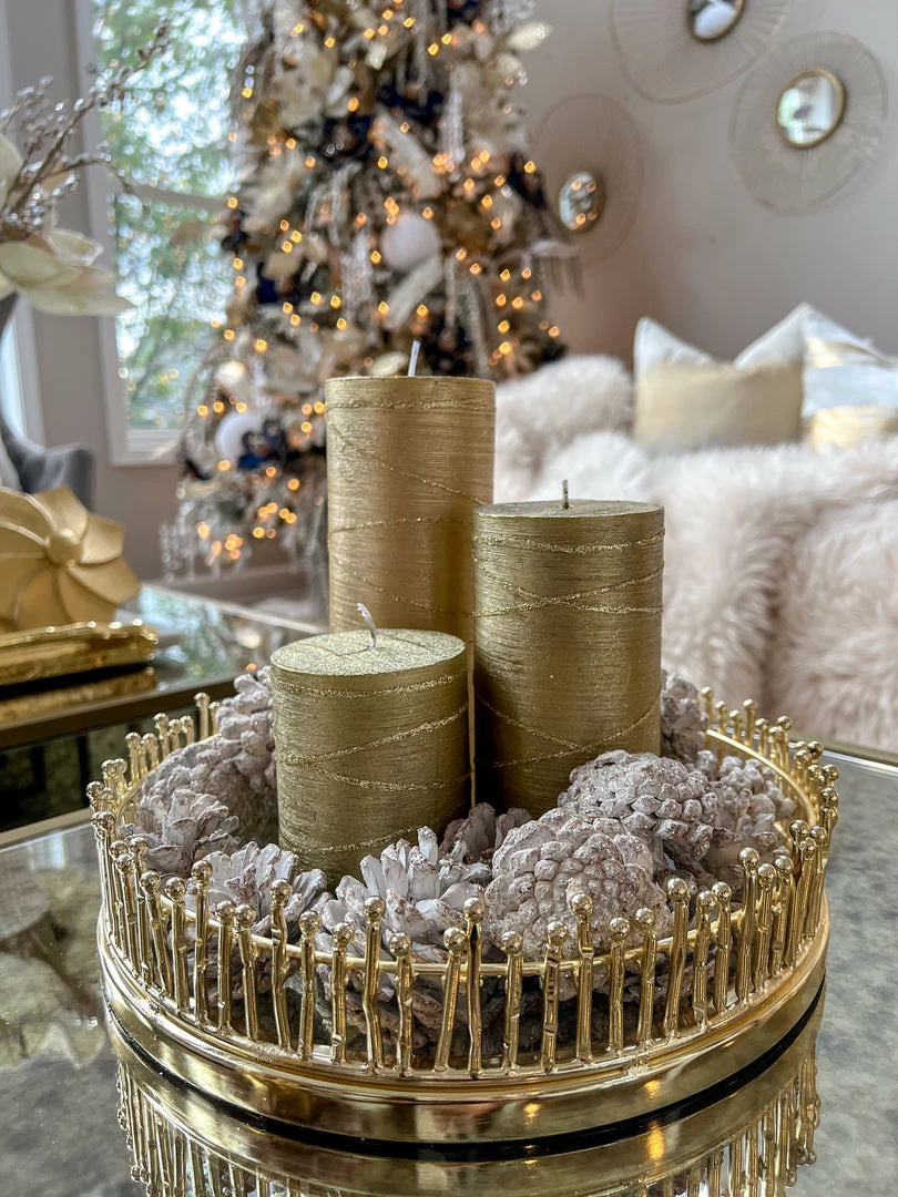 Description: These pillar candle feature a festive gold metallic finish with glitter detailing and are perfect to warm up your home and create an illuminating environment.
