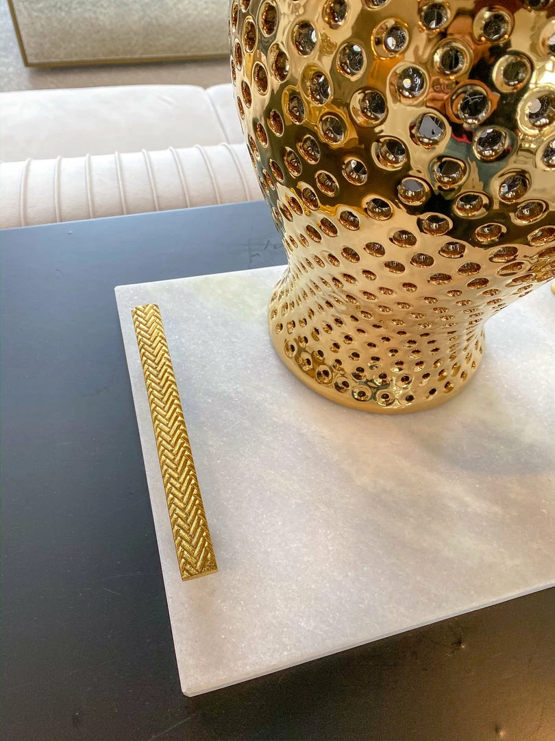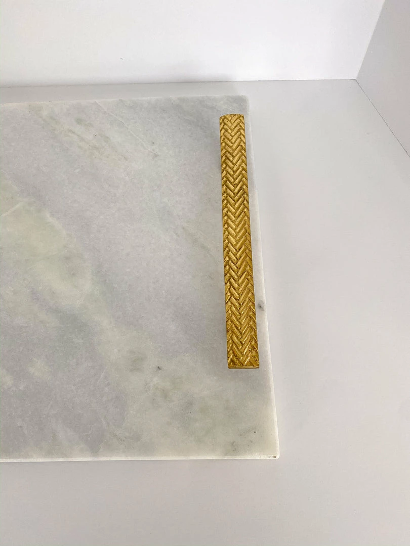 Description: Serve your guests in style with this beautiful herringbone marble tray! Featuring gold handles and a matching serving knife, this piece is functional as well as stunning!