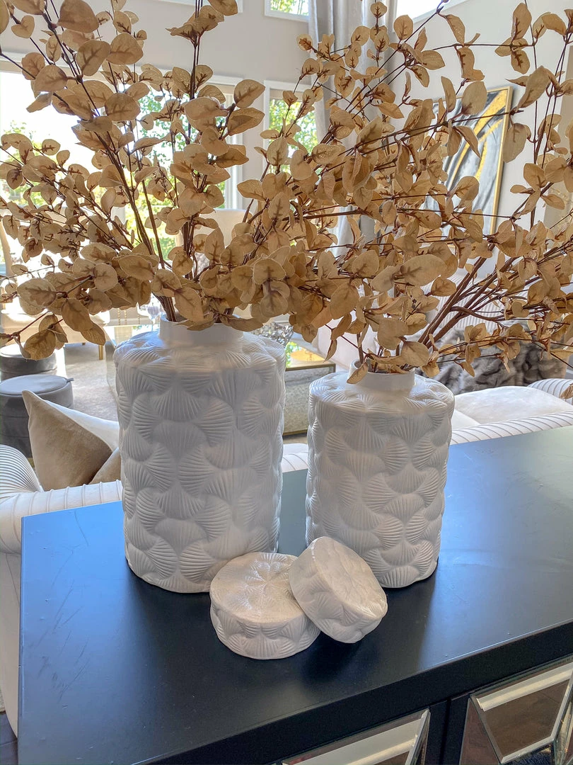 Description: These jars are covered with white shell shapes that add a unique texture.