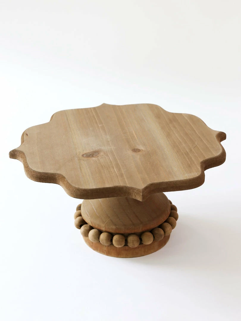 Description: This elegant wood cake stand features a unique shape top and wood beaded details on the base. The perfect way to mix in glam and rustic designs into your home!