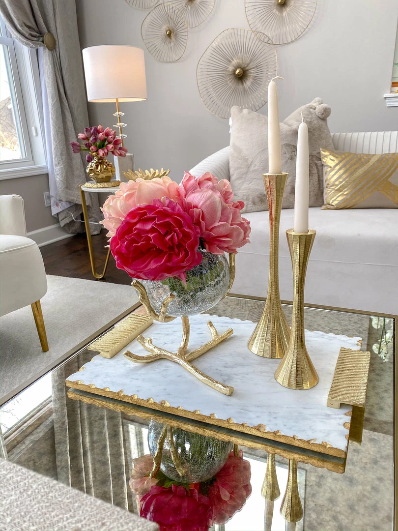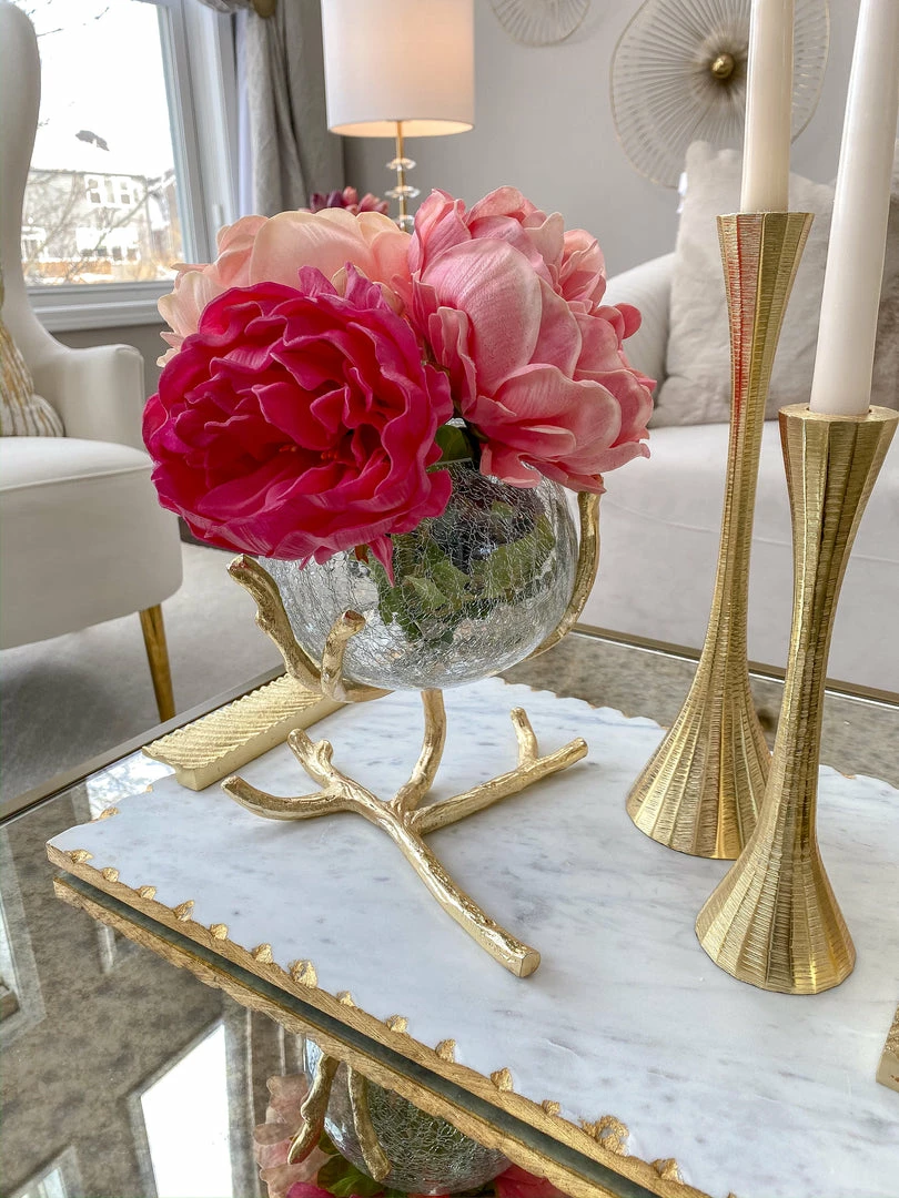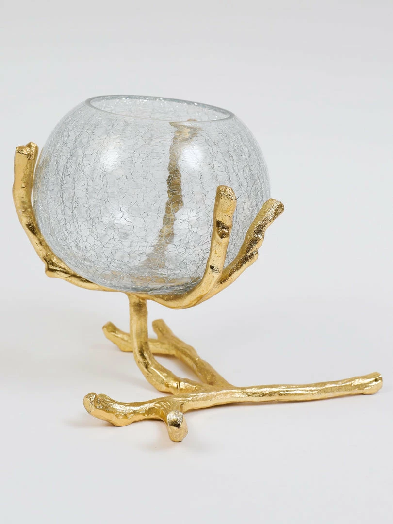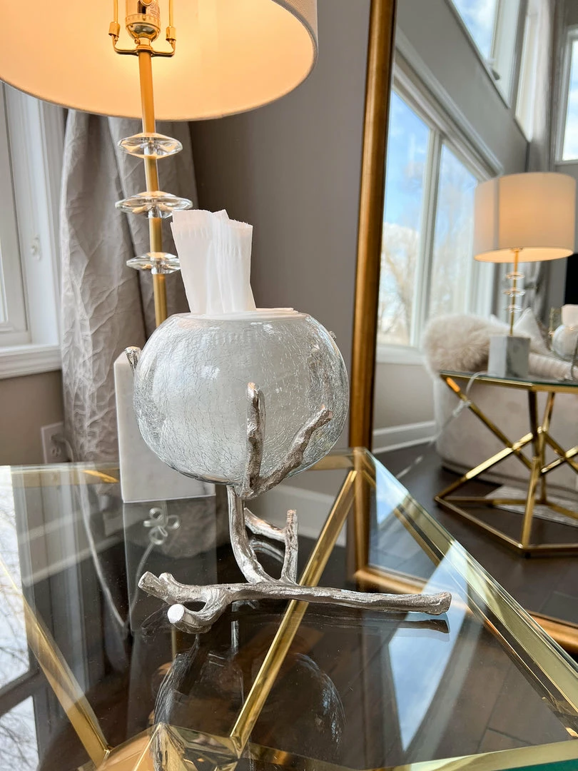 Description: Available in silver and gold, this beautiful piece is so versatile. It is sure to add some delight and whimsy to your home! The metal branch stands rests with a large crackled glass bowl to perfectly capture the light of your favorite candles or house beautiful floral arrangements as well! This makes the perfect tissue holder but is elegant and adds some style.