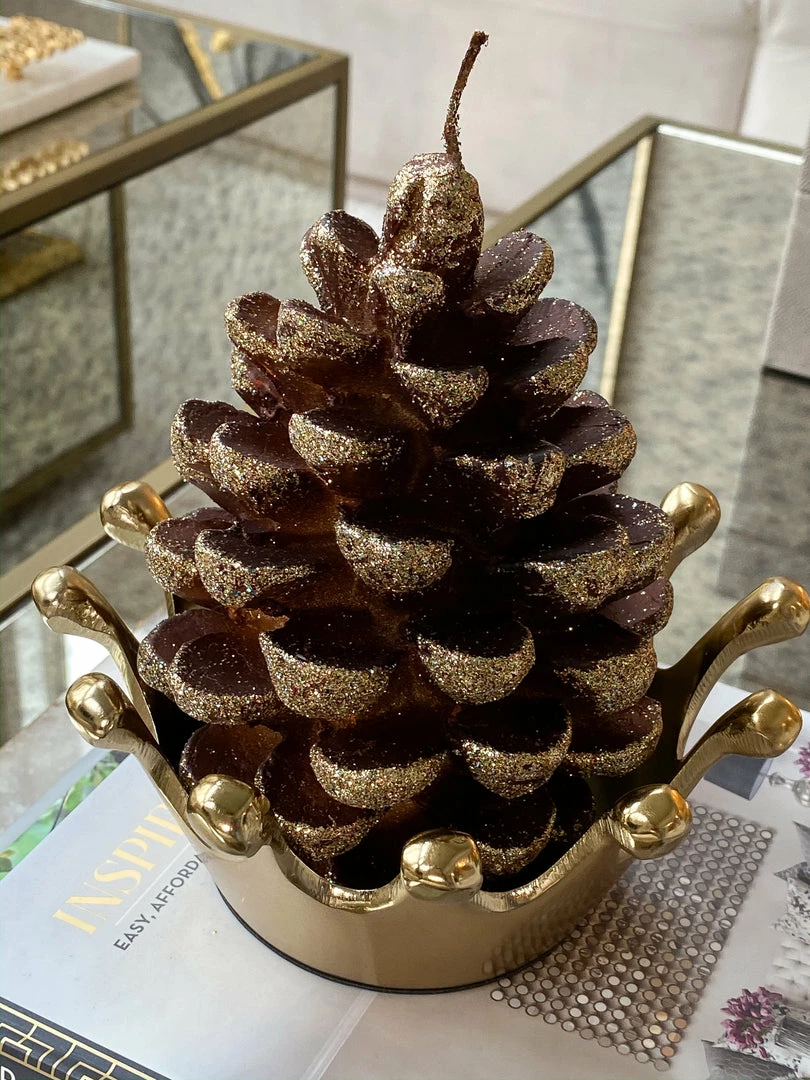 This pinecone shaped candle is an elegant way to style your centerpiece or mantle for the holidays! style on a candle holder or under a cloche.