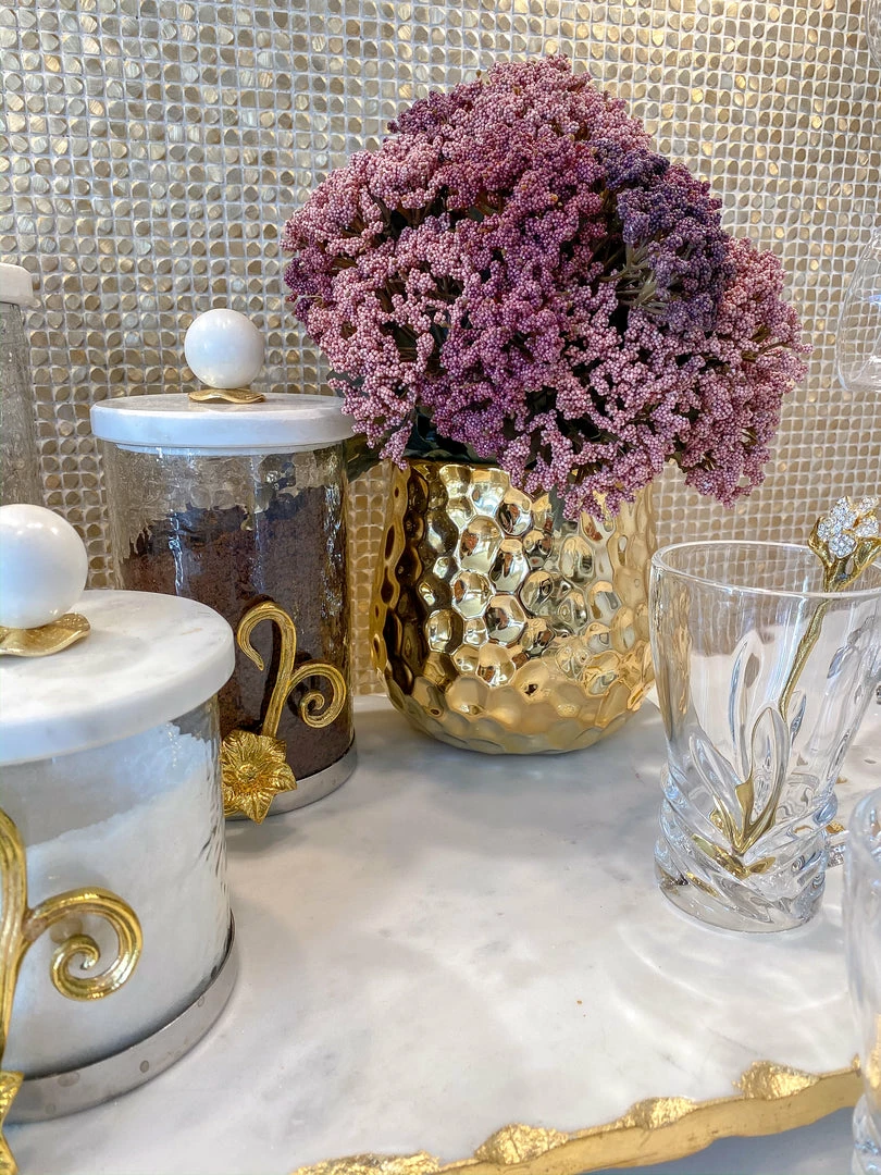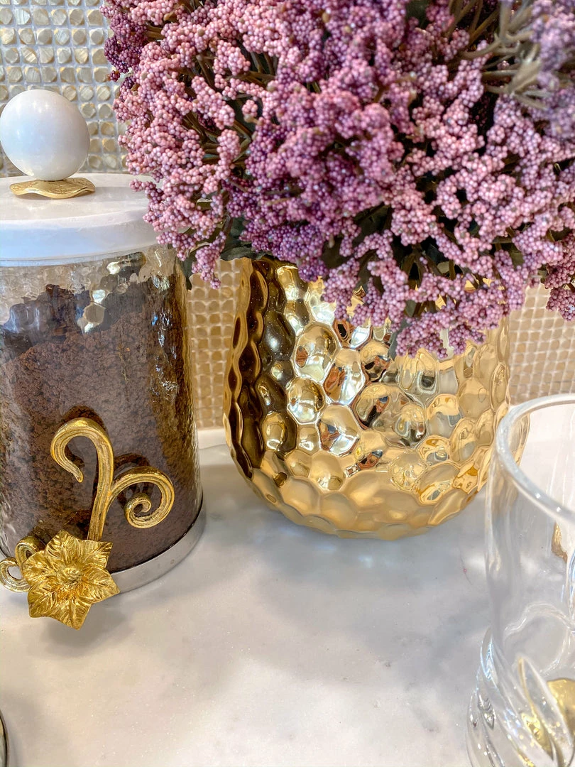 Description: This gold hammered vase with a unique texture perfectly catches the sunlight.