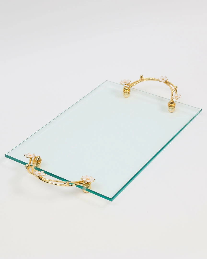 Description: This large rectangular glass tray has stunning gold detail and gold handles with a cherry blossom design!