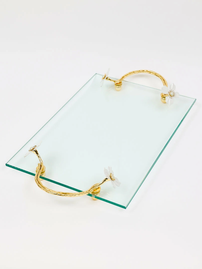 Description: This beautiful rectangular glass tray has stunning gold details with a white jeweled flower design!