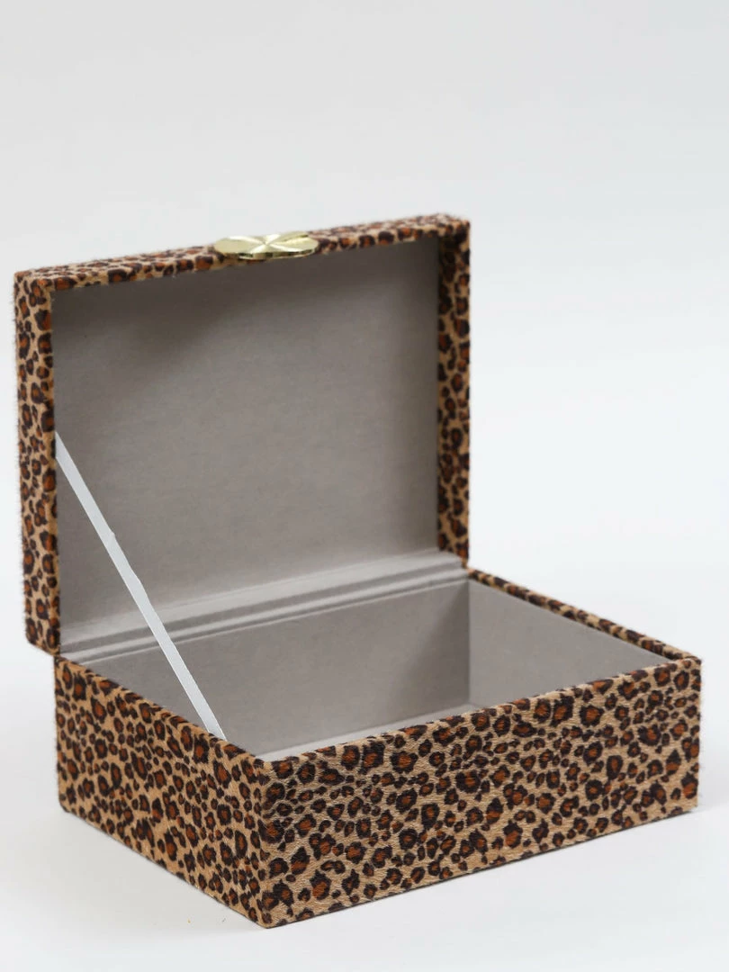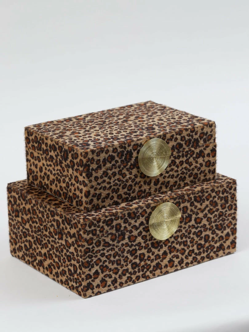 Description: This box set is perfect for the fierce home decor! The set features a velveteen fabric with a dark leopard print pattern. The gold medallion on the front ties these back to all of your gold decor. Can be styled together, or separately, and they are great for storing things like remotes and other items.