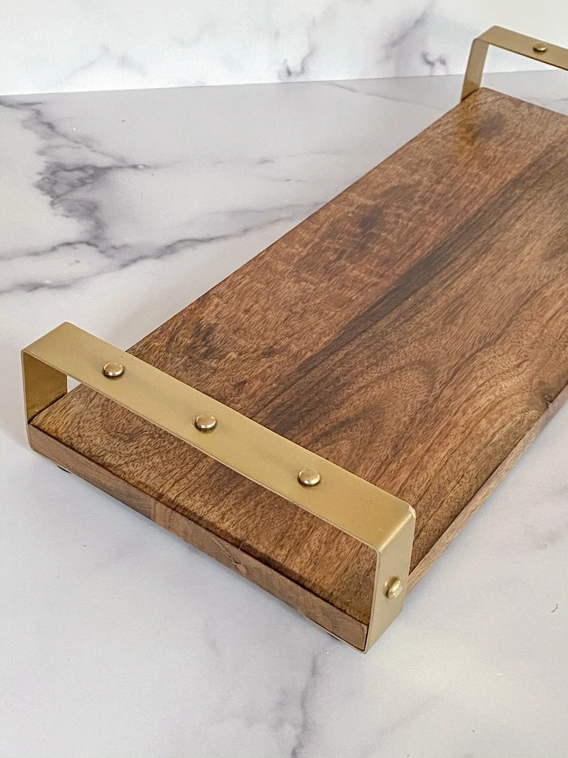 This dark wooden tray features nice gold beaded handles and is perfect for fall! Ties back perfectly to our larger wood trays as wel!