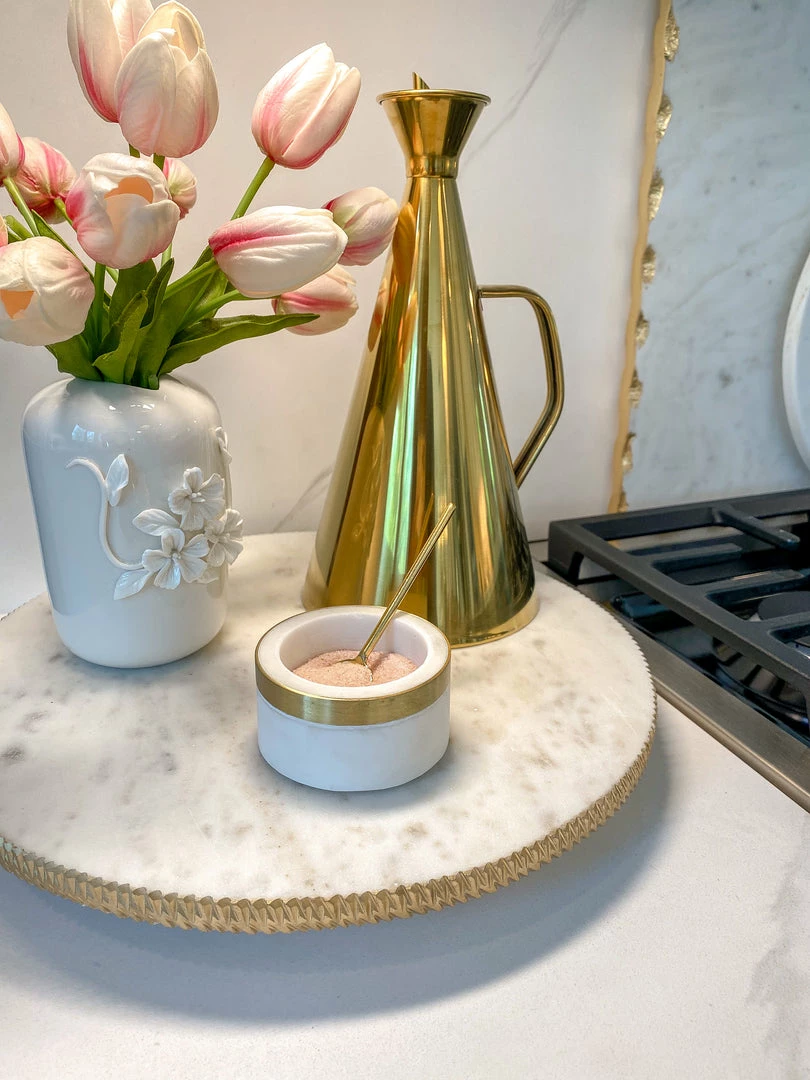 Description: This stunning round marble bowl is a stylish piece to add to your serving decor! Perfect for your favorite herbs and spices!