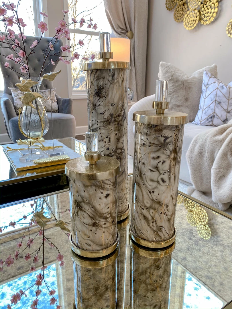 Description: These stunning marbled pattern jars come in three sizes and are a stunning way to bring texture and height to your decor! Perfect for any coffee table. We love the elegant colors that these give off.