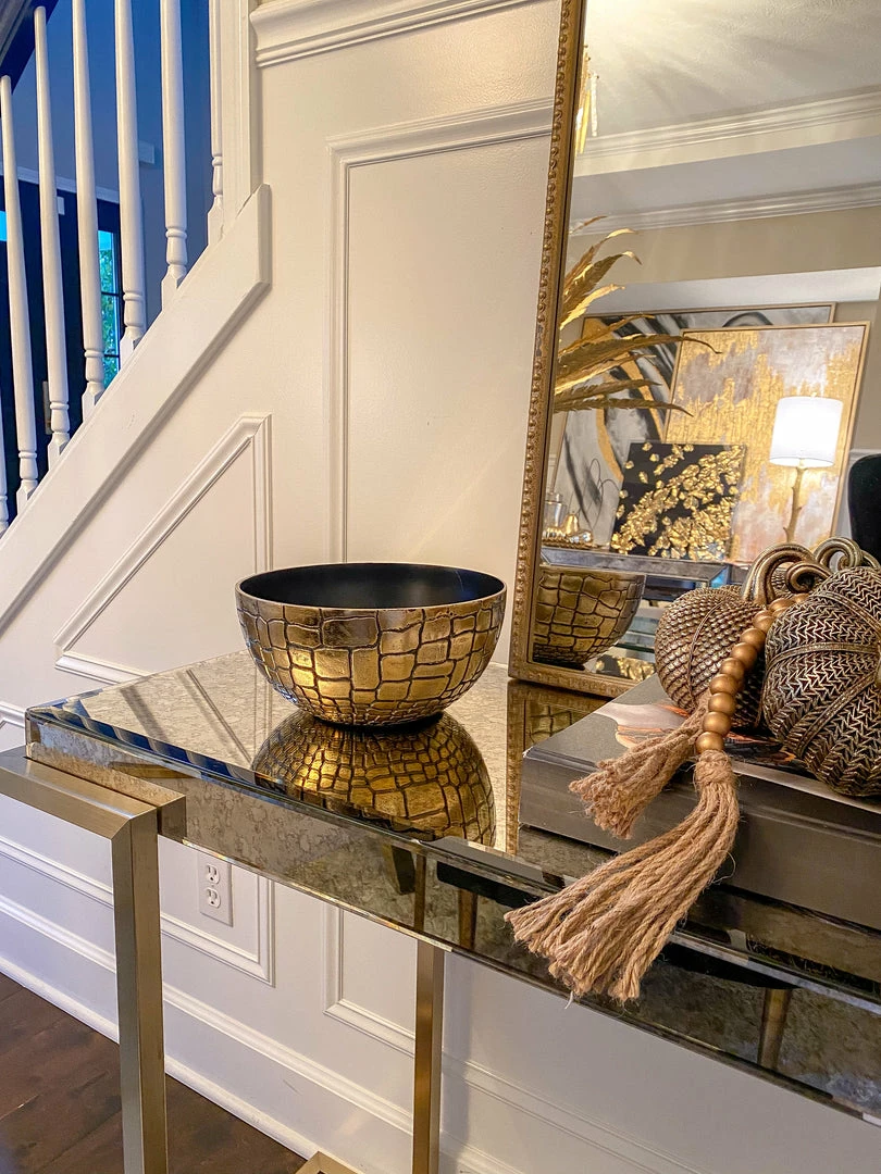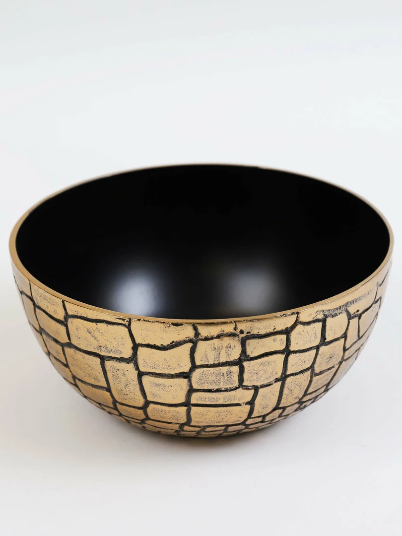 Description: The unique crocodile texture of this gold bowl stands out from traditional houseware. Pair this with other items from this collection for a complete look.