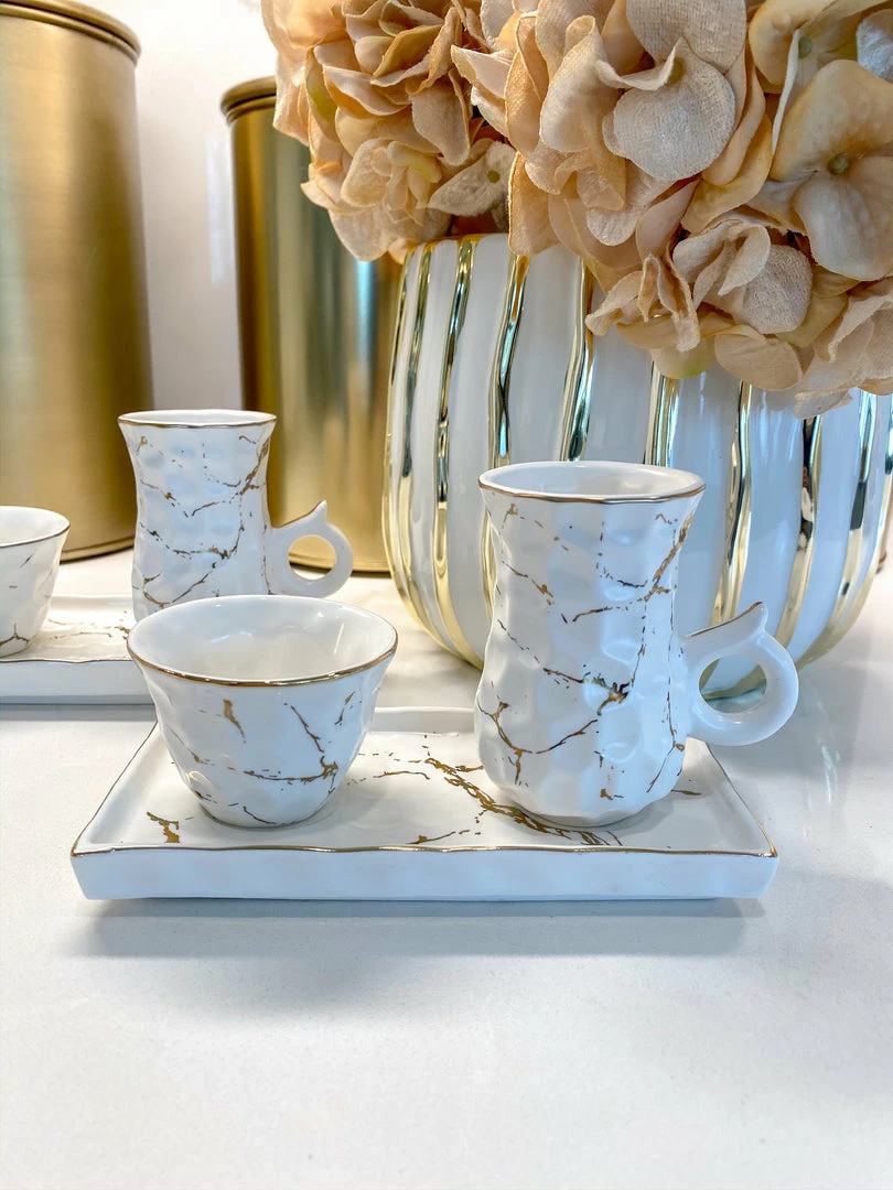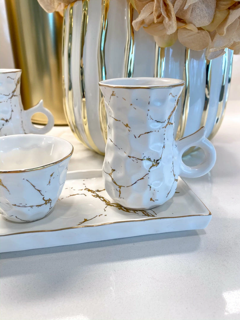 Description: Enjoy your afternoon tea with a touch of elegance. This cream and sugar set features a metallic gold marble print which beautifully updates the classic experience of sophisticated tea party.