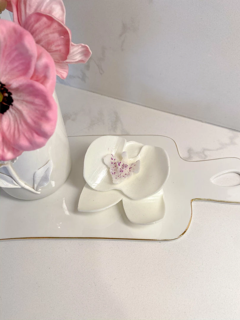 Description: This beautiful orchid soap is perfect for your bath decor! Simply peel off a petal and use that to wash up. Each soap design comes with a small plastic dish to set the petal on until it is used up!