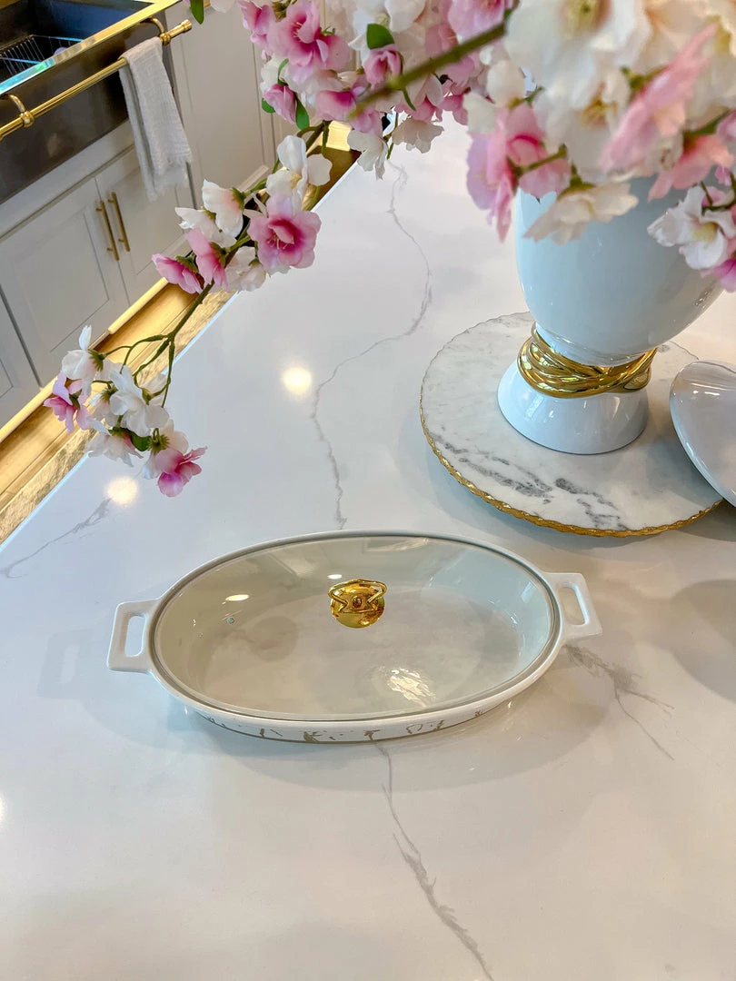 Description: This white and gold marbled print oval ceramic dish is perfect for making a statement at your next dinner party.Â