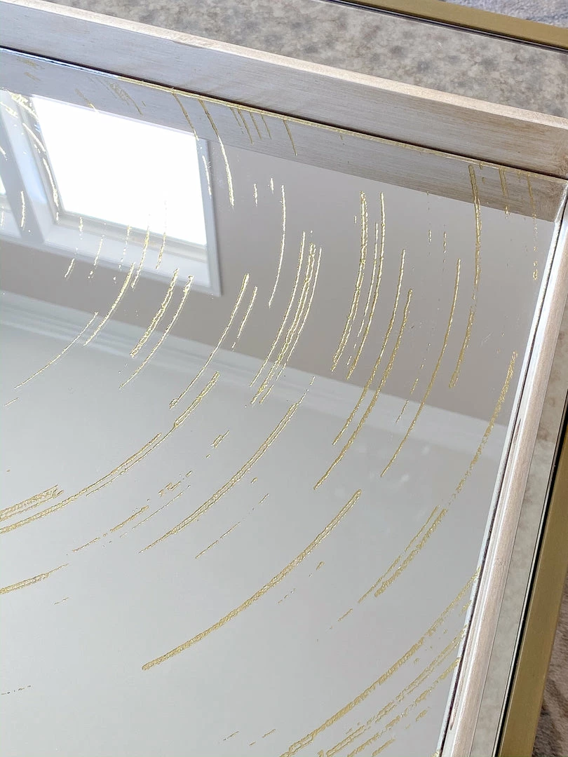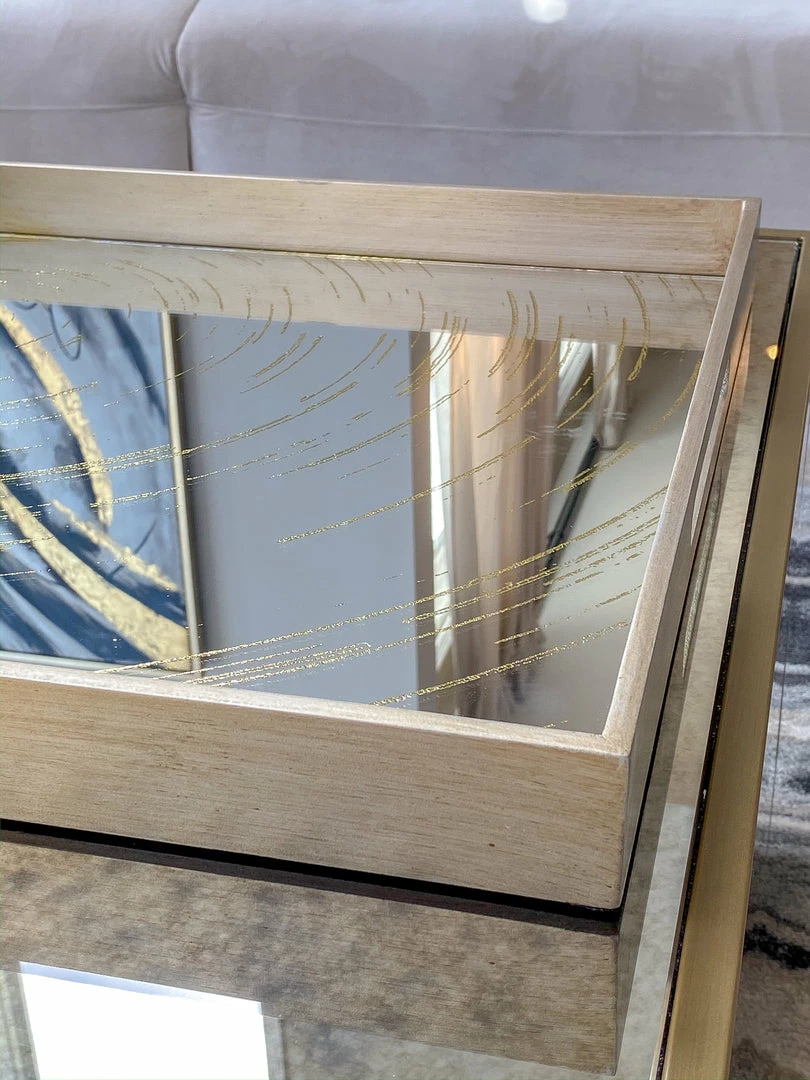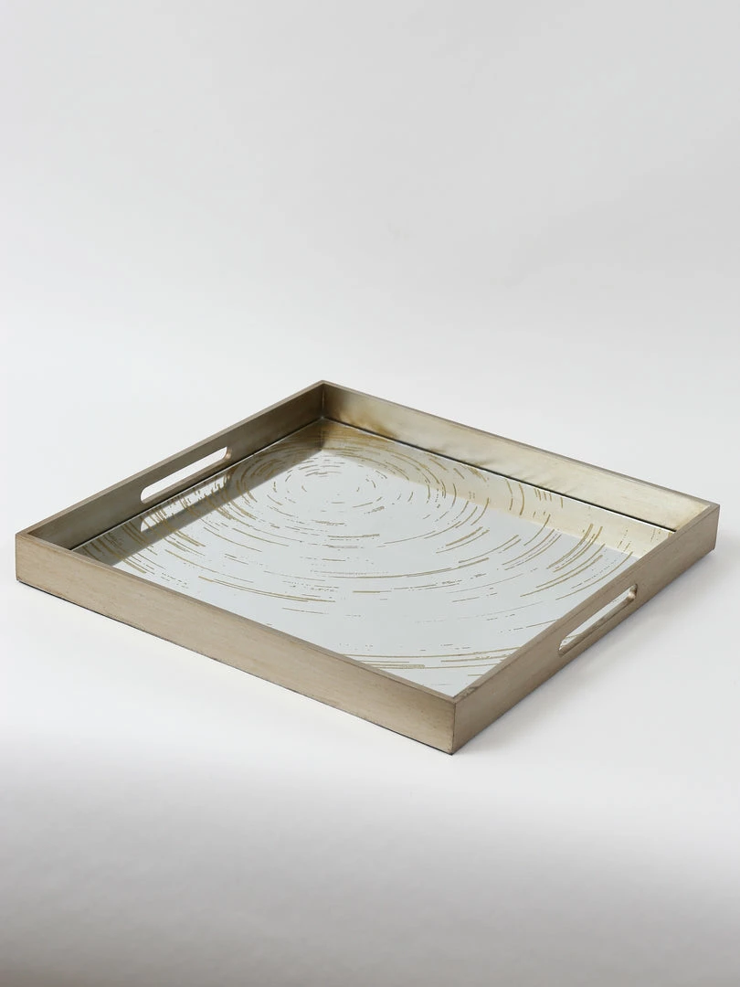 This oversize tray features a mirrored base with a small circle pattern. It is a very substantial piece and is perfect piece for your coffee table
