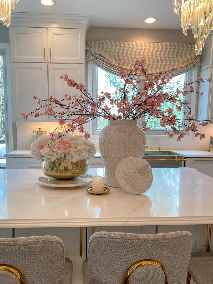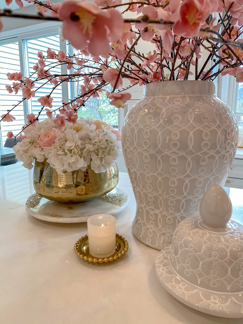 Description: This white ginger jar is a very substantial piece. It stands at 25″ high! This piece is perfect for holding your taller faux floral stems or just to style on its own next to your favorite decor.