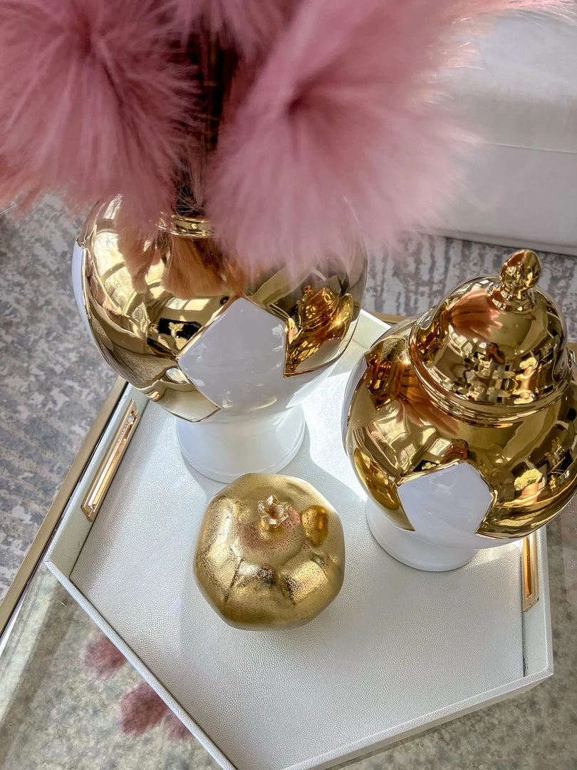 Description: These hexagon trays are so luxurious, they feature gold handle details and faux leather material.