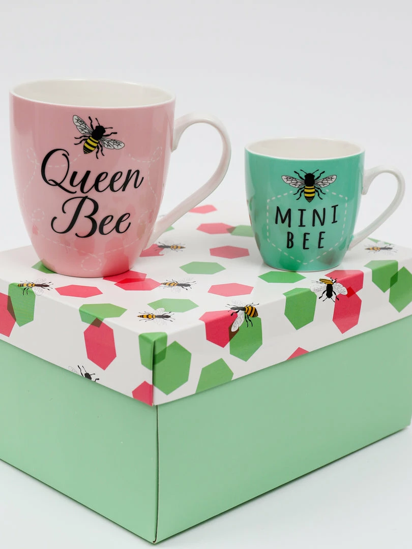 Description: This adorable mug gift set is perfect for new mothers and more. The 17 oz. mug reads: “Queen Bee” and the 7 oz. reads “Mini Bee” in mint with bee icons.