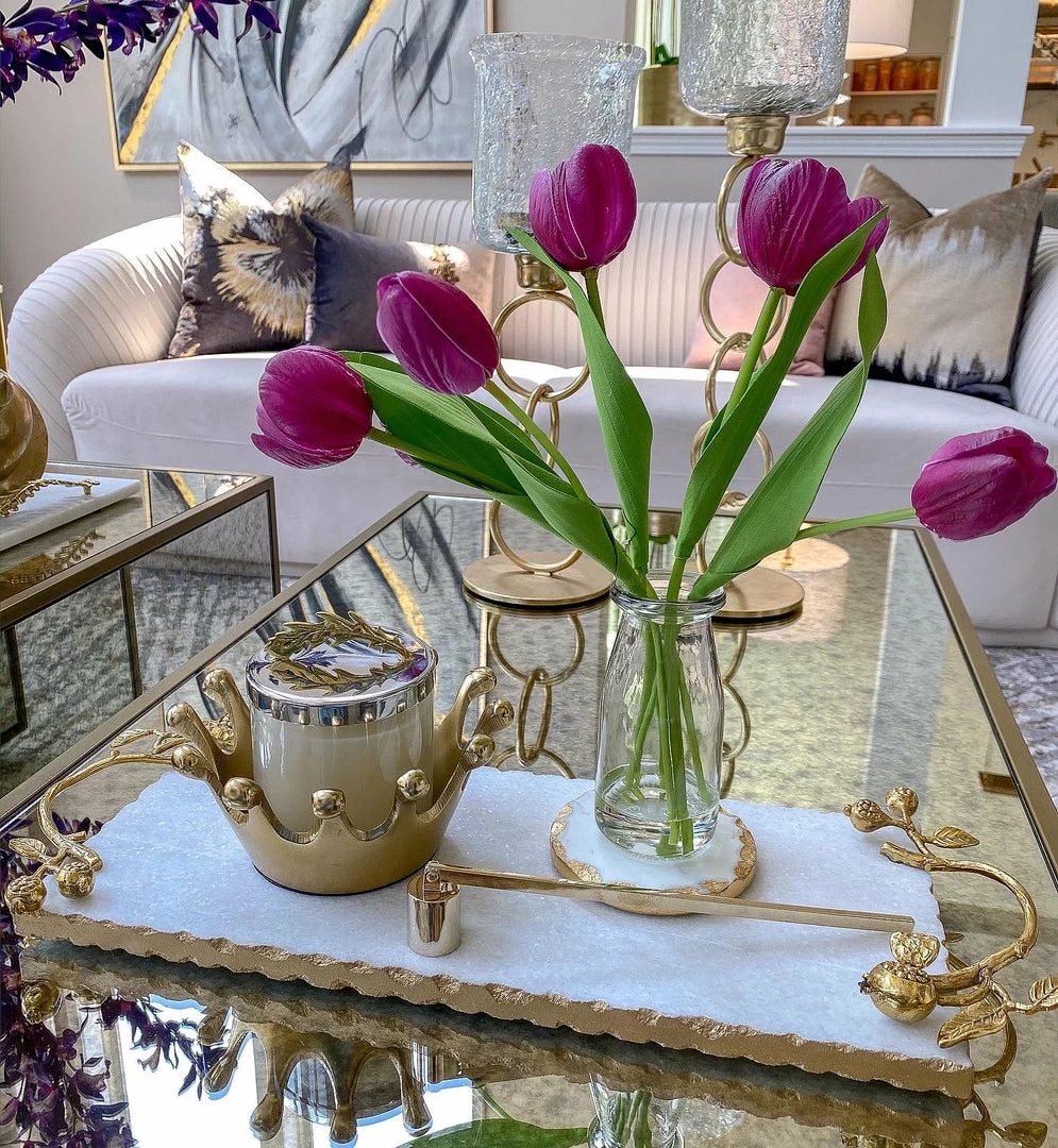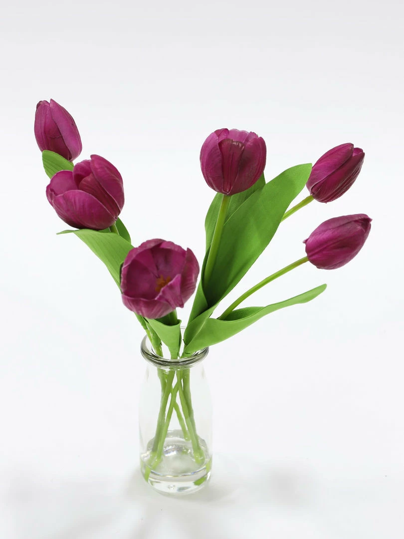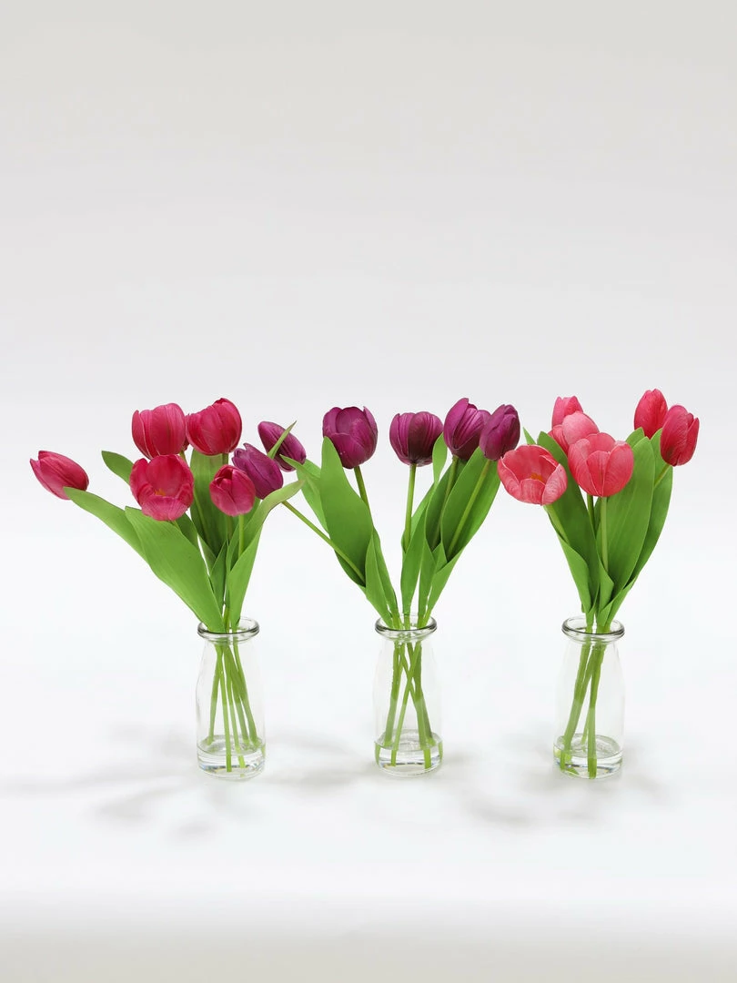 Description: These delicate tulip arrangements are the perfect spring accessory! Each arrangement comes with beautiful brught tulips arranged in a clear glass vase. Available in pink and purple!