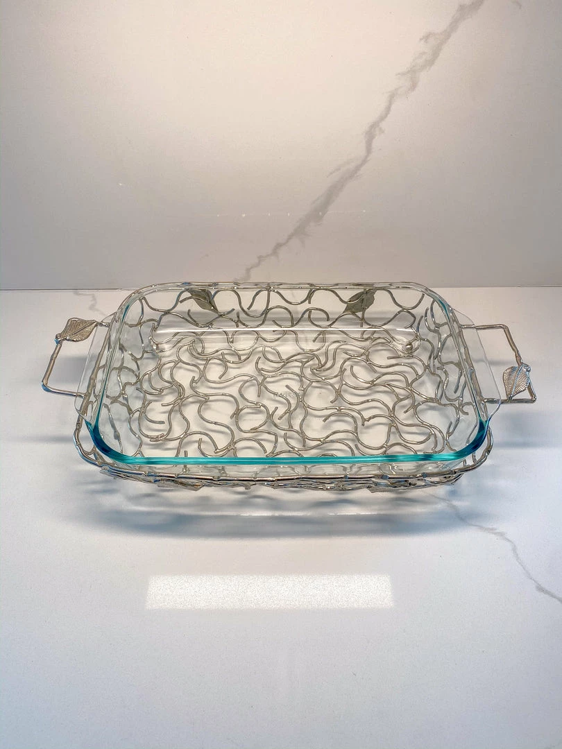Description: We brought this piece back in silver finish because of popular demand! We love the intricate detailing the metal base gives and the functionality of the glass pyrex. Why sacrifice style for functionality?