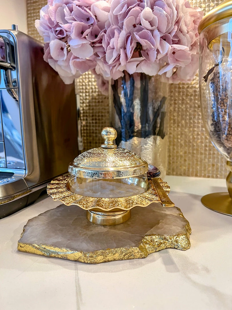 Description: This universal jar has a gold hammered lid and can be used for almost anything! It will be great for sugar, honey, jam, etc. Comes with a matching spoon.