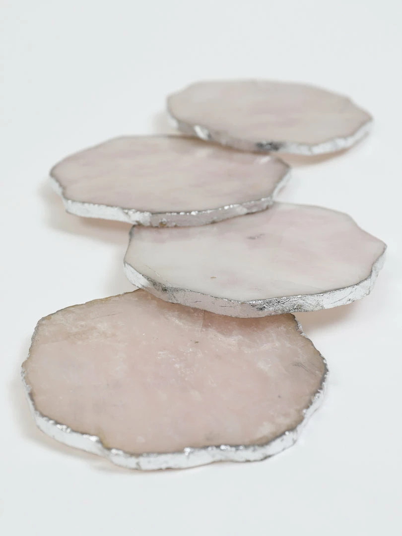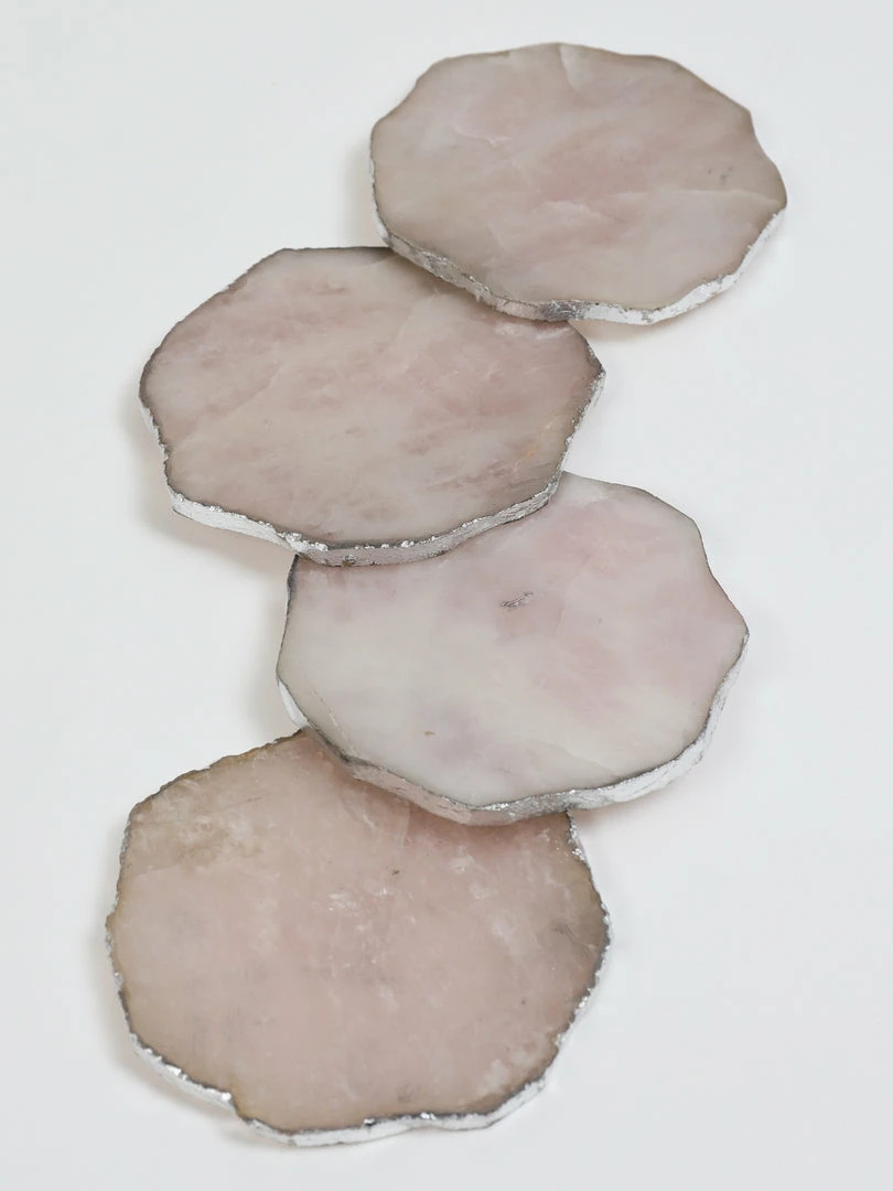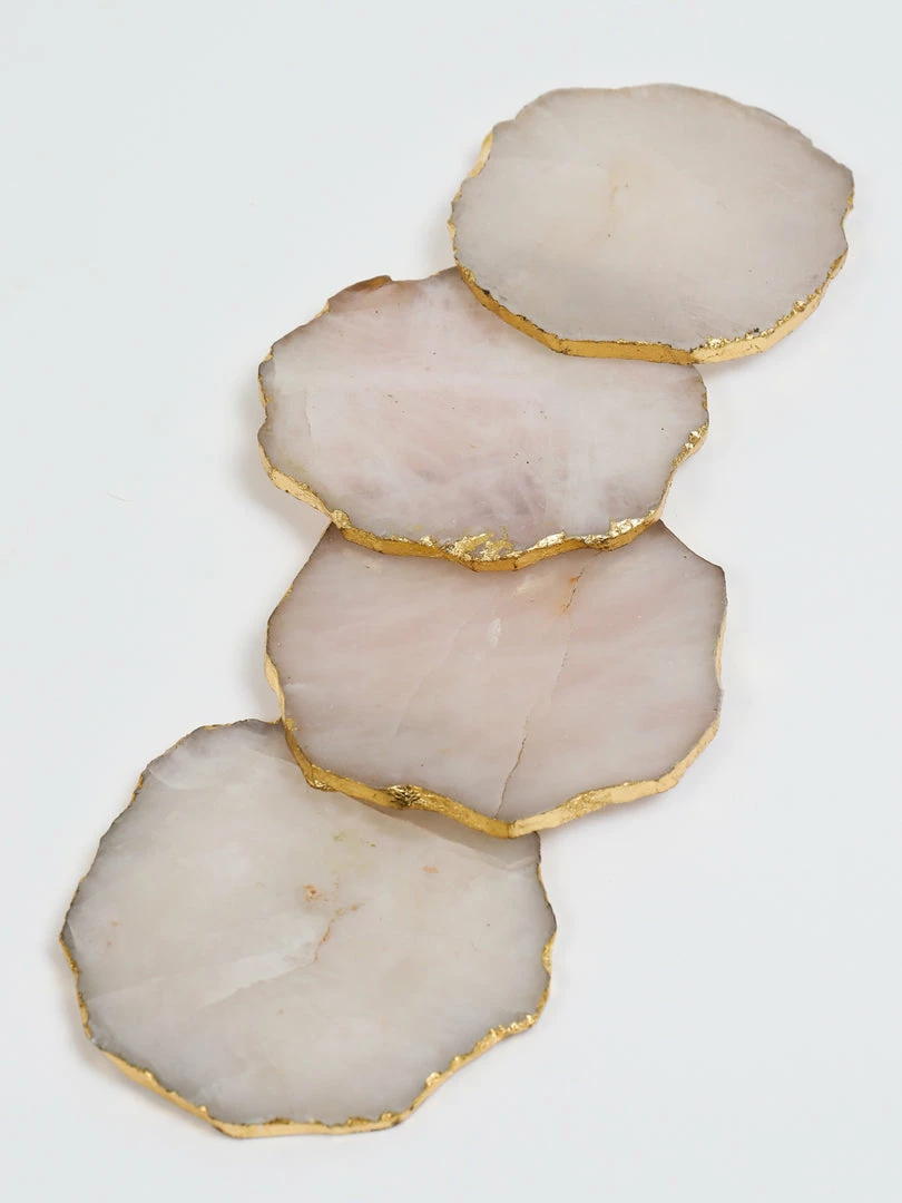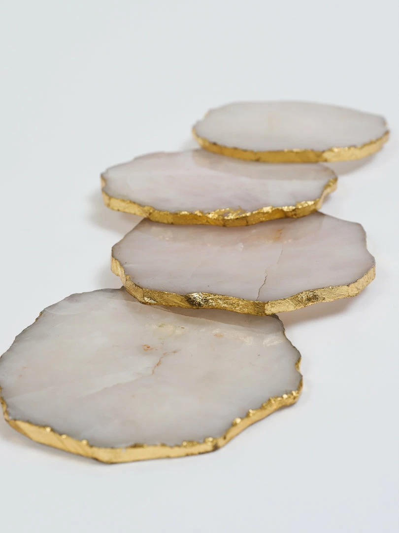 Description: These real quartz coasters have a beautiful distressed gold detail that will add an elegant touch to any surface in your home! They are very large and substantial and are great to layer with trays or candles!