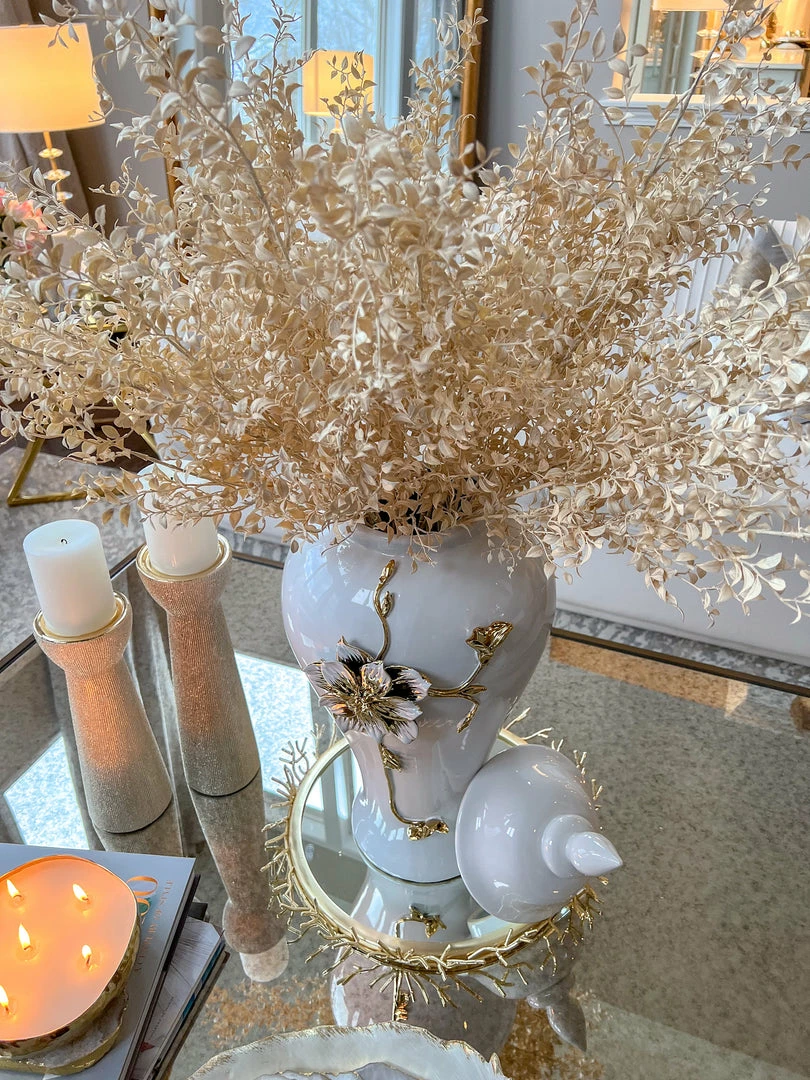 Description: This round mirrored tray features a fun textured gold border that will bring texture and glam to your decor! This is a great layering piece!