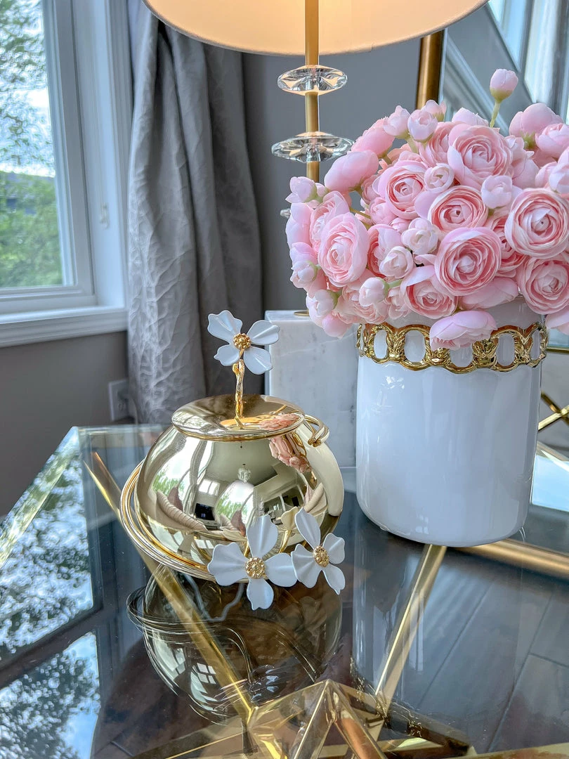 Description: This gold round dish has a cover and is intricately detailed with white jeweled flowers.