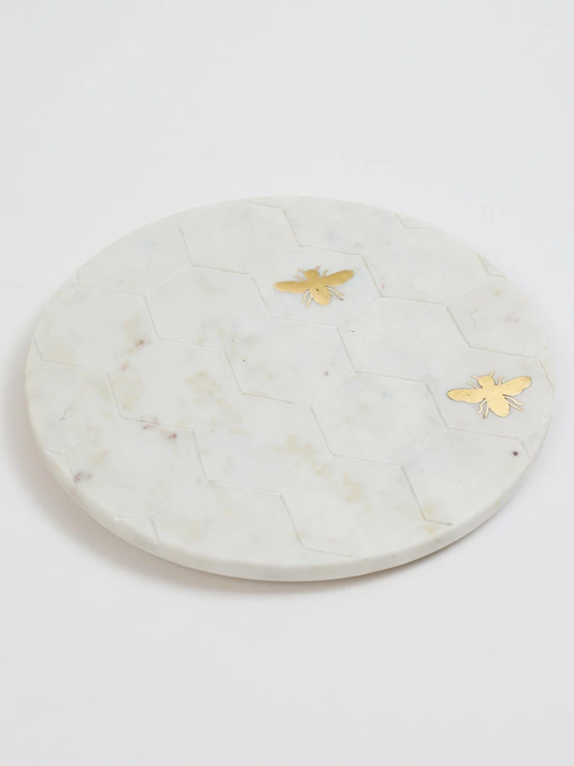 Description: This round marble platter features gold bee inlays and a hexagon pattern! We love the little details that make it so interesting!
