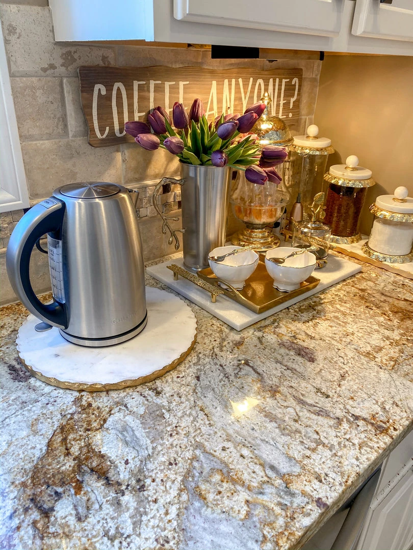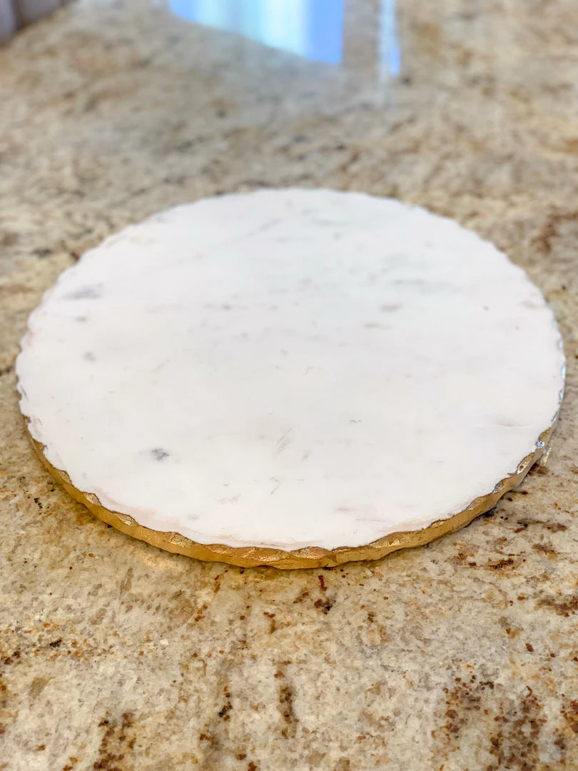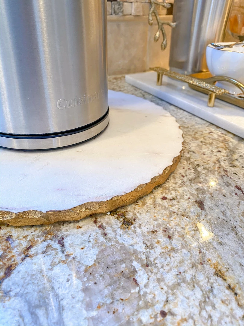 This round marble tray is a must-have for your coffee station or centerpiece! The shape makes it an interesting base for any vignette.