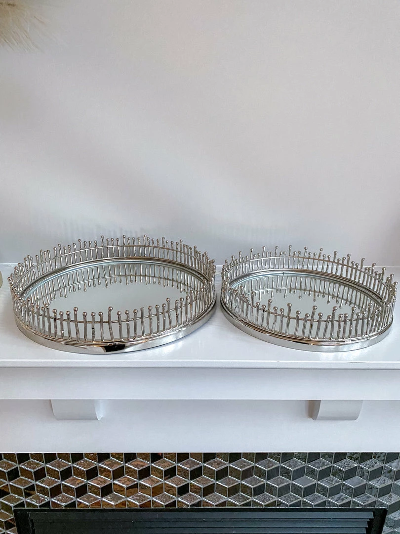 Description: This stunning round mirror tray offers a unique elegant fence detail. The straight design of the metal border featured stunning textures and details! Available in two sizes, and in gold or silver!