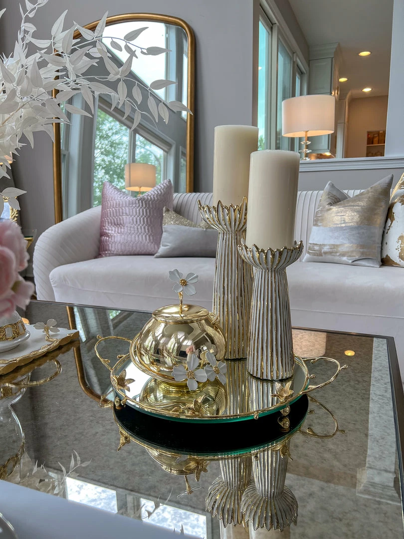 Description: This is a round mirror tray with stunning gold flower details and handles.