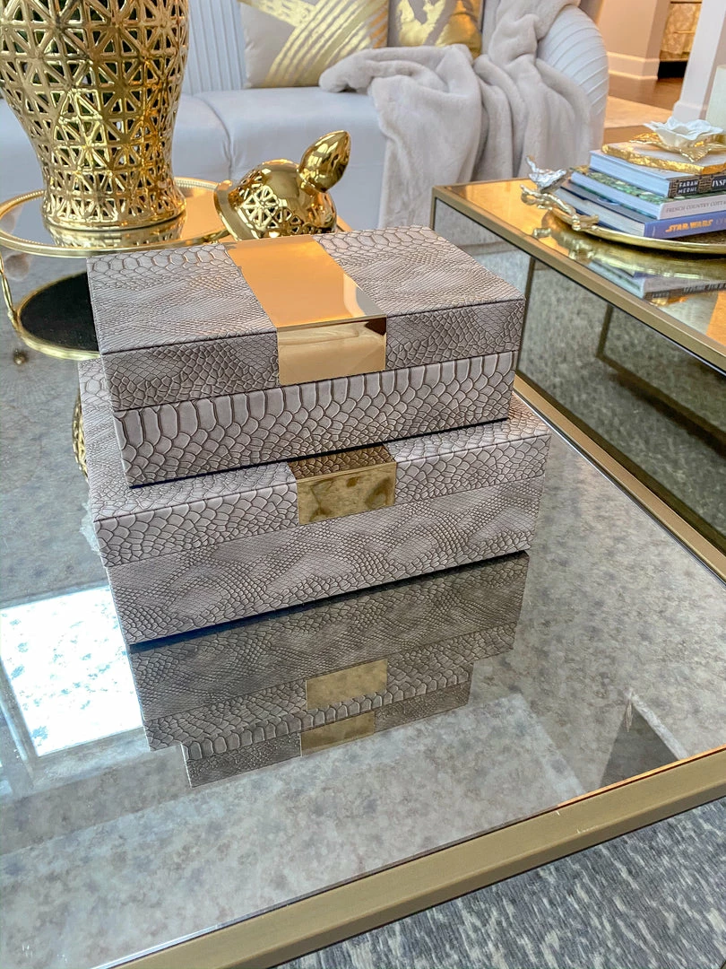 Description: Secure your treasures in this fierce set of boxes! Featuring a grey snakeskin print and gold detail, this piece is the perfect combination of wild style and fierce luxury!