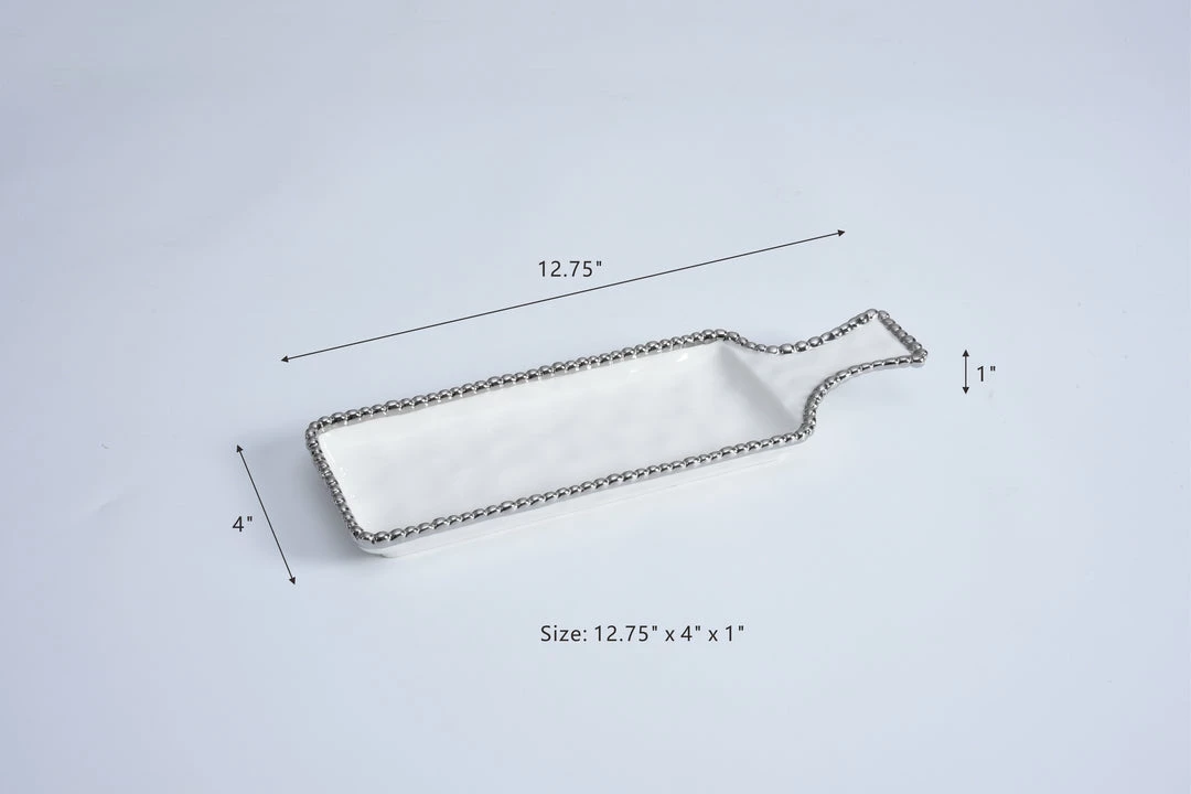 Description: This high quality porcelain is a miracle material! It is food safe, dishwasher safe, and oven safe up to 350 degrees! Made in Argentina, this beautiful porcelain is also tarnish free, scratch/stain resistant, will not lose its beautiful luster, and is perfect for everyday life! Baking and serving never looked so good! This silver and white beaded tray can be used to display snacks or side dishes at your dinner table, or can be used to style decor elsewhere in your home! Love that it ties back to many of our other porcelain pieces.