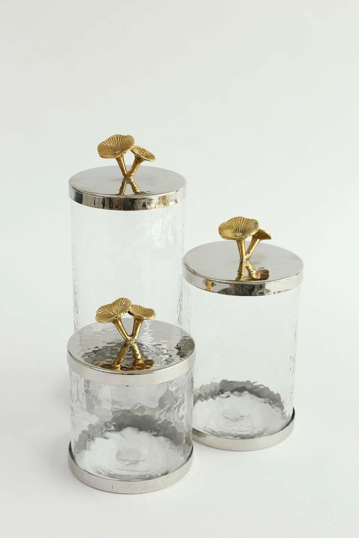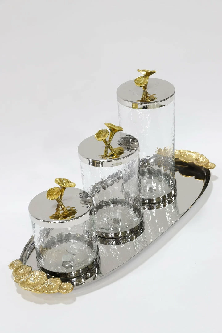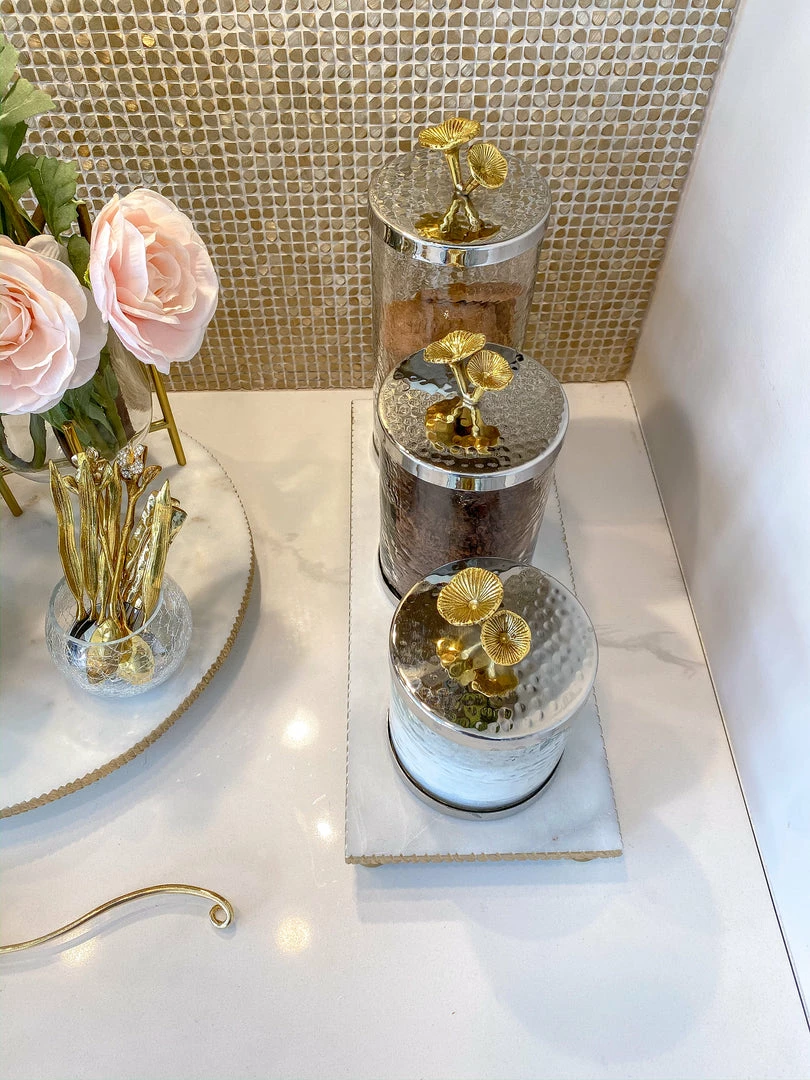 Description: These silver and gold top canisters are a beautiful design! The lids feature a silver base with accents of gold floral pieces that make them extra unique!