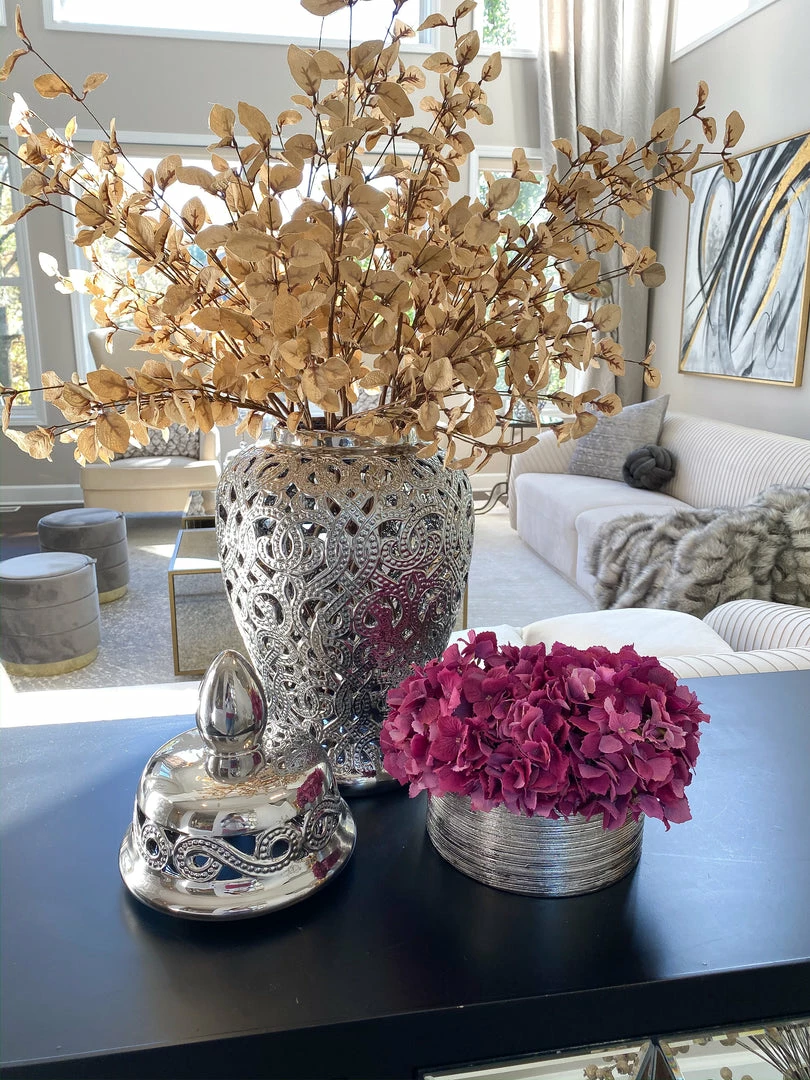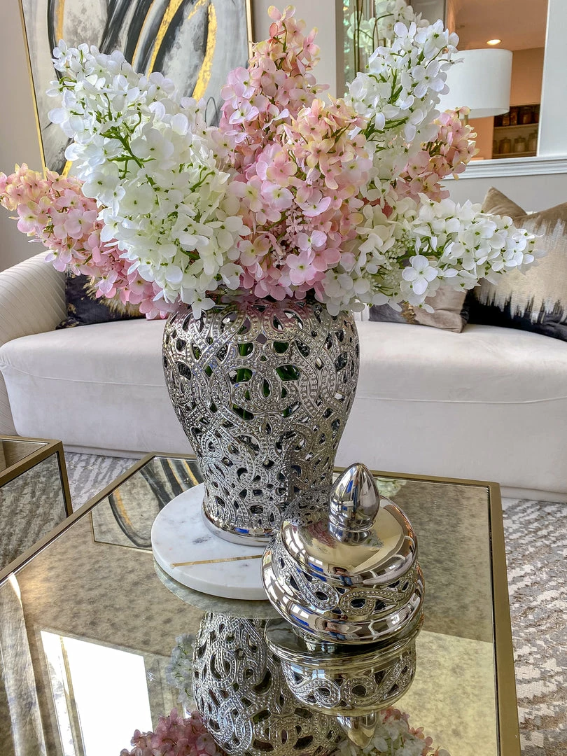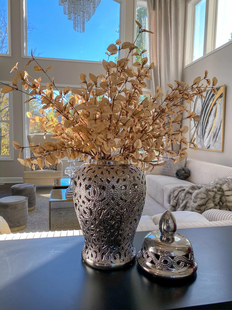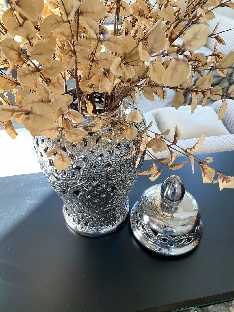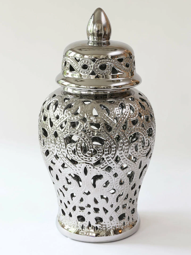 Description: This silver cut-out ceramic ginger jar is perfect for any decor!
