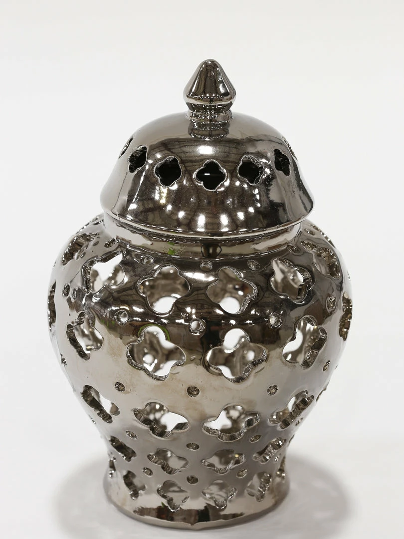 Description: Want the classy look of a ginger jar but don’t have the space? This extra mini silver ginger jar is perfect for you! Standing at only 9.5 inches tall, this is perfect for tabletop decor, or will make a great detail on a desk in your office space! Classic elegance at the smallest scale!