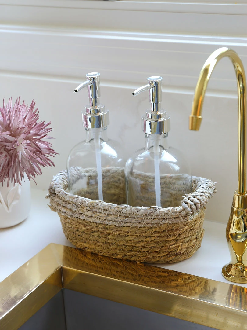 Description: This beautiful soap dispenser set is perfect for your bathroom or kitchen decor! Each set comes with 2 glass soap dispensers and a cute storage basket!