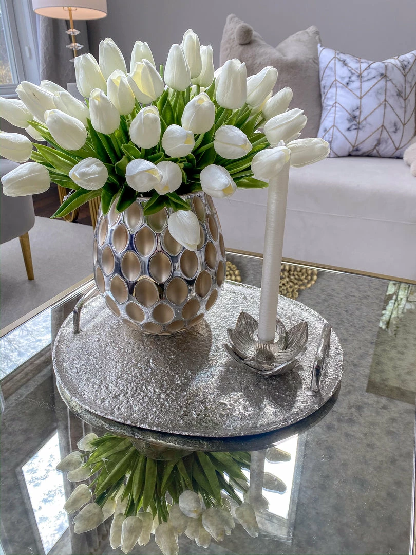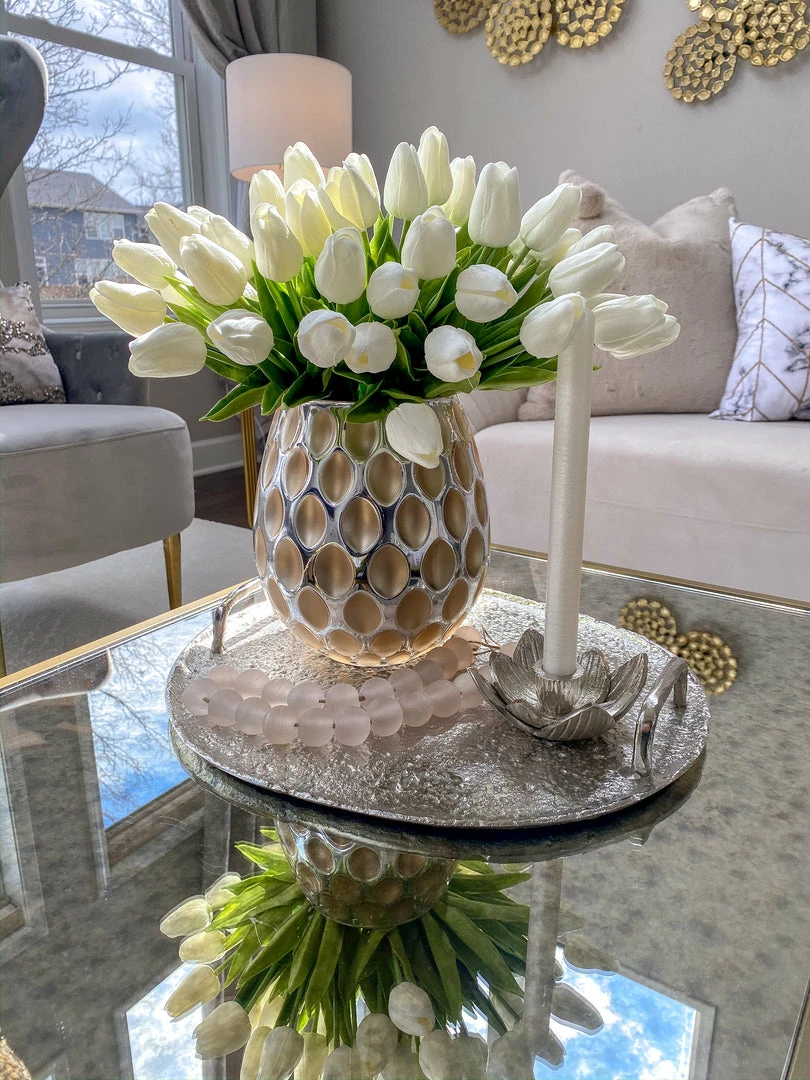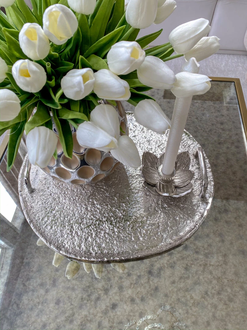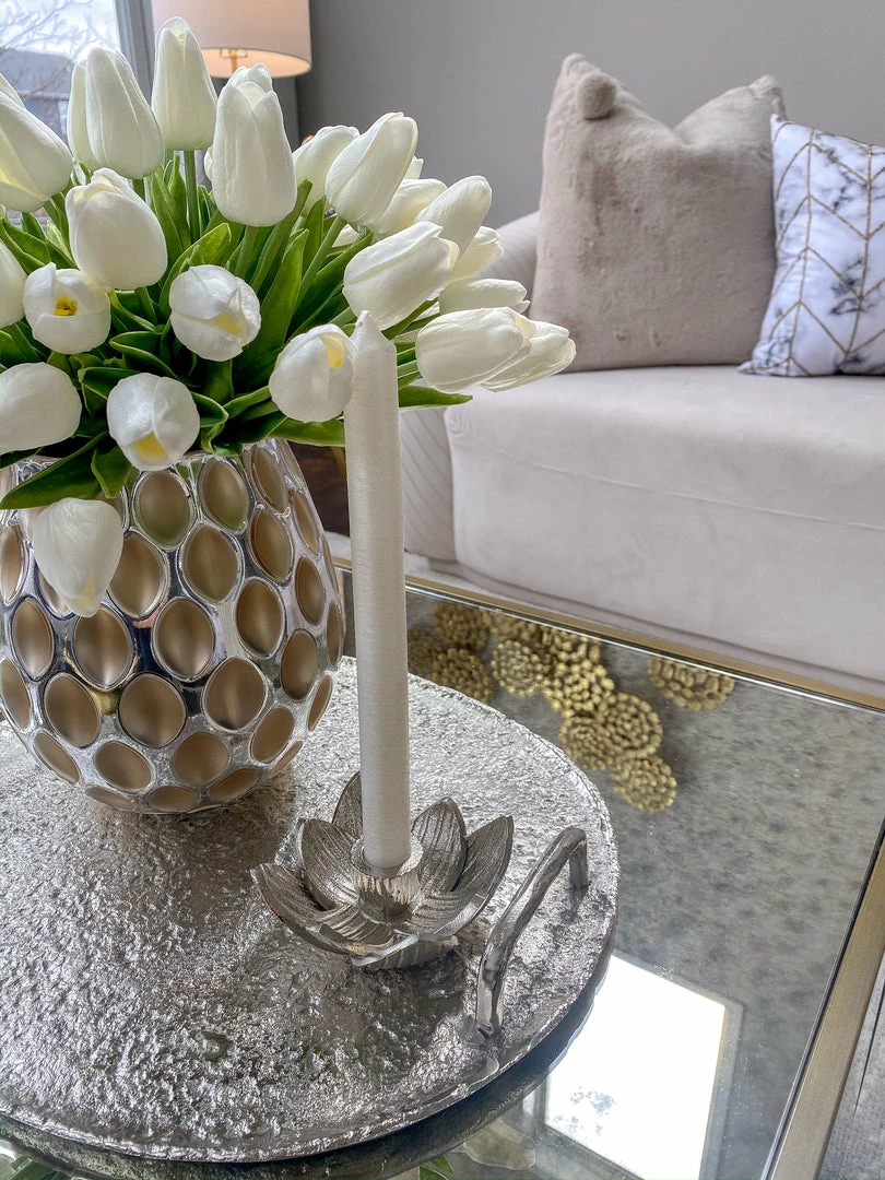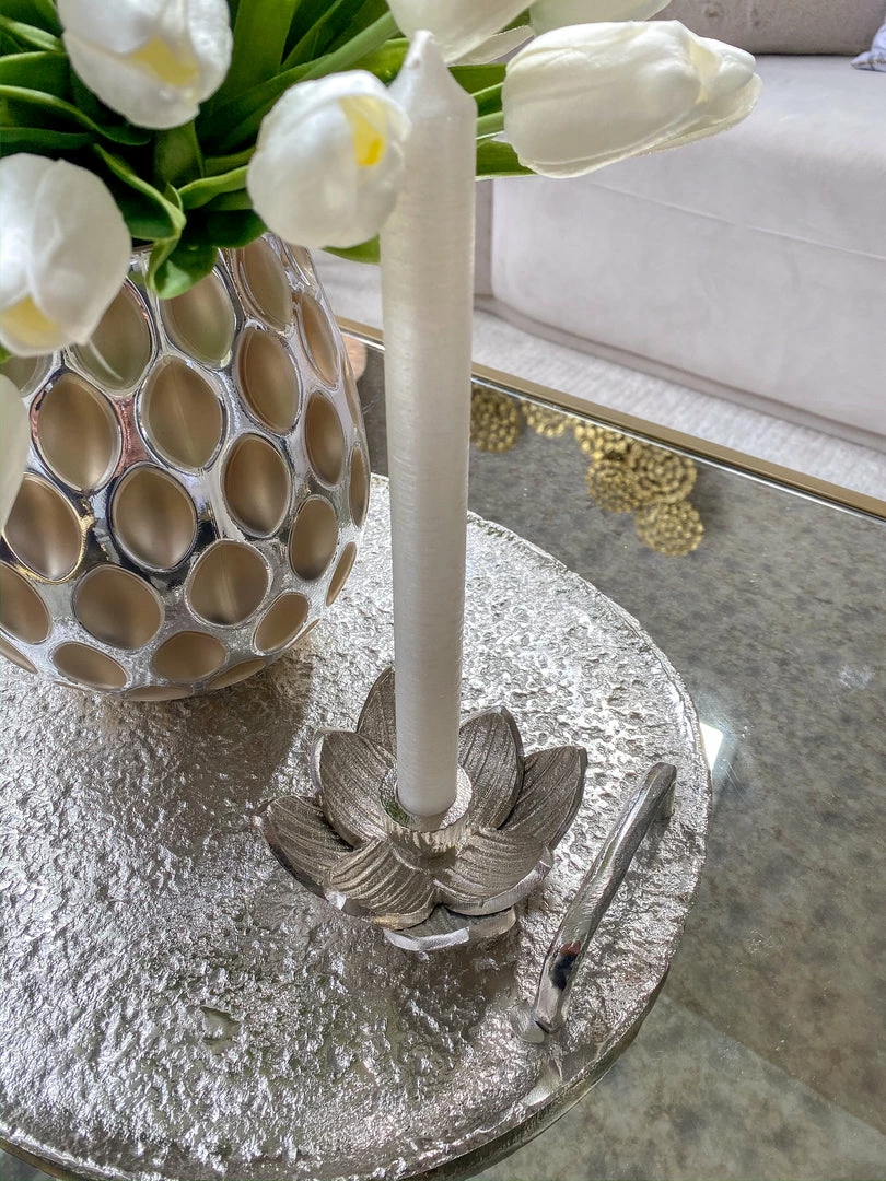 Description: This metal lotus candle holder is such a cute addition to any tray in any setting! Add a tapered candle stick and you have an adorable piece! Comes in gold and silver.