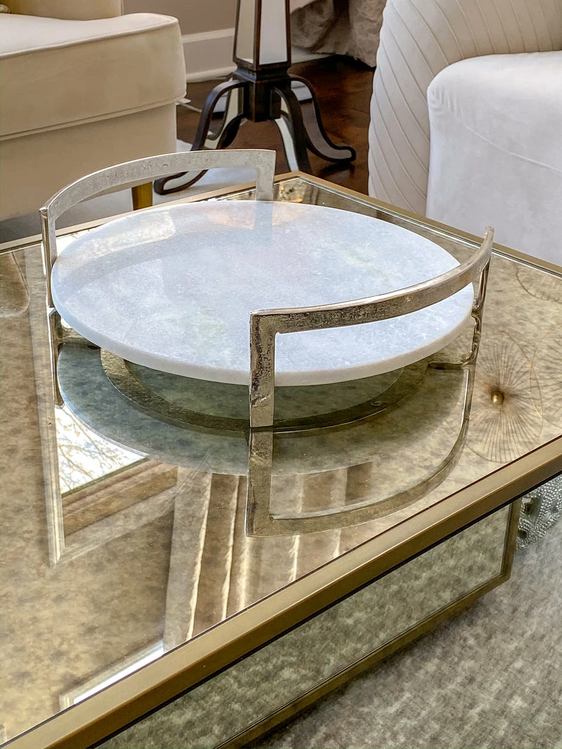 This awesome marble and metal tray features sturdy metal handles with a modern transitional flare and a beautiful round marble slab to hold your favorite pieces.