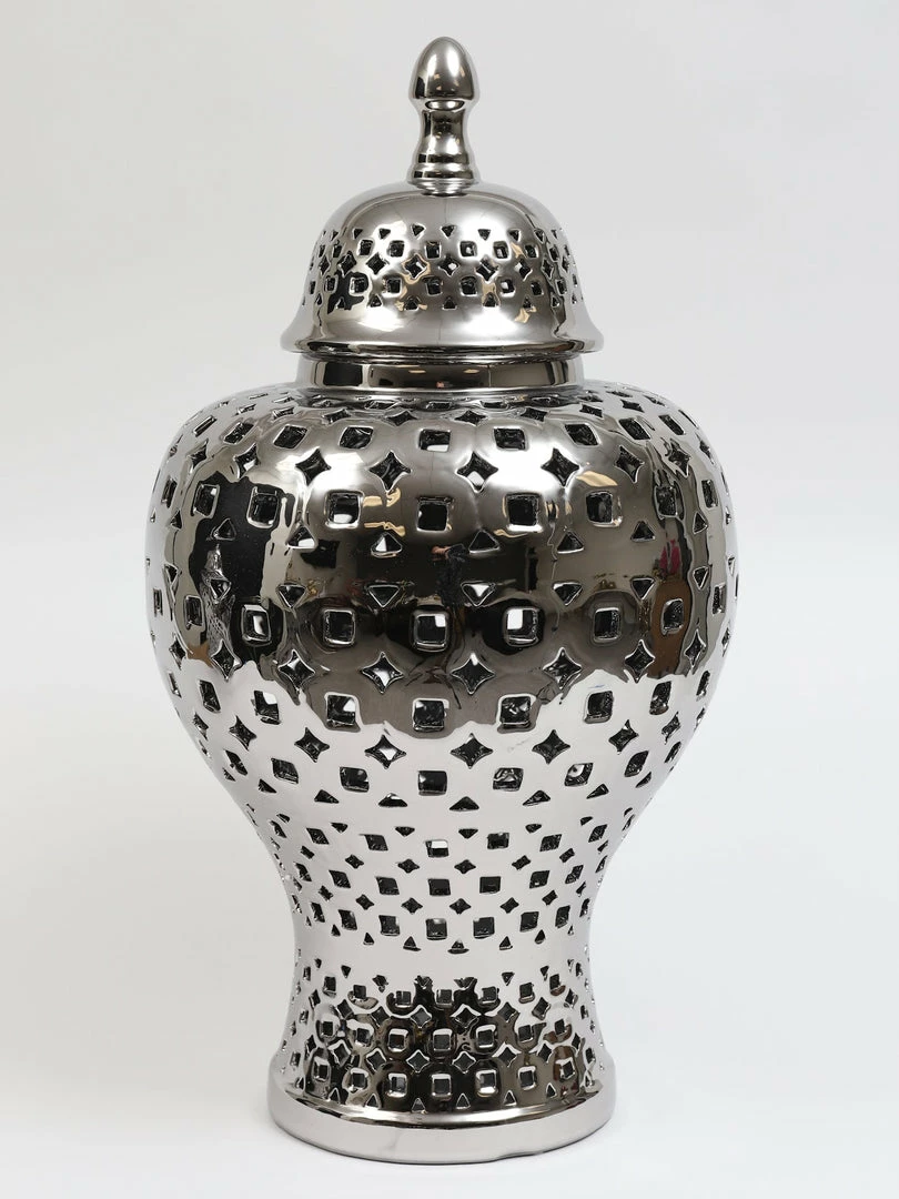 Description: This Silver pierced ginger jar will make a great addition to your home decor! Displayed with your favorite florals or on its own, either way, this piece will make a dynamic centerpiece!