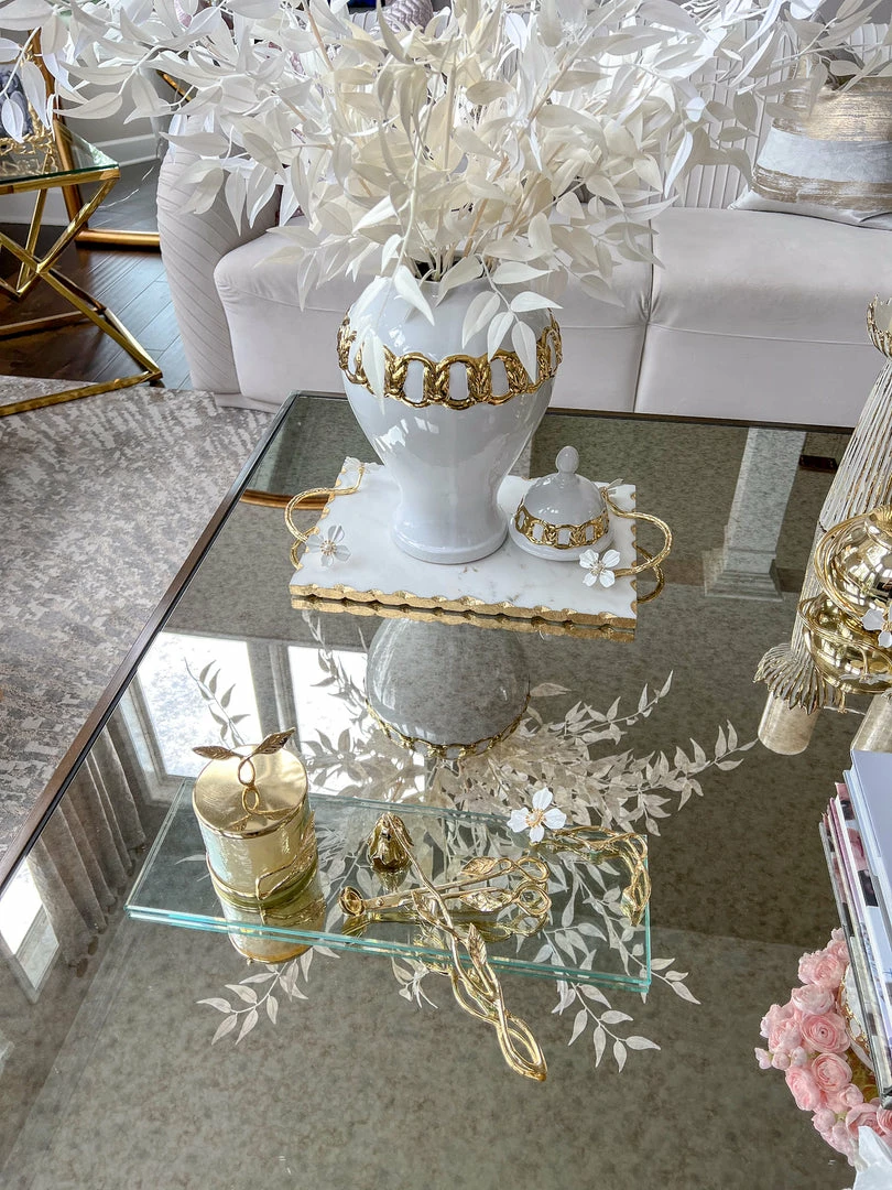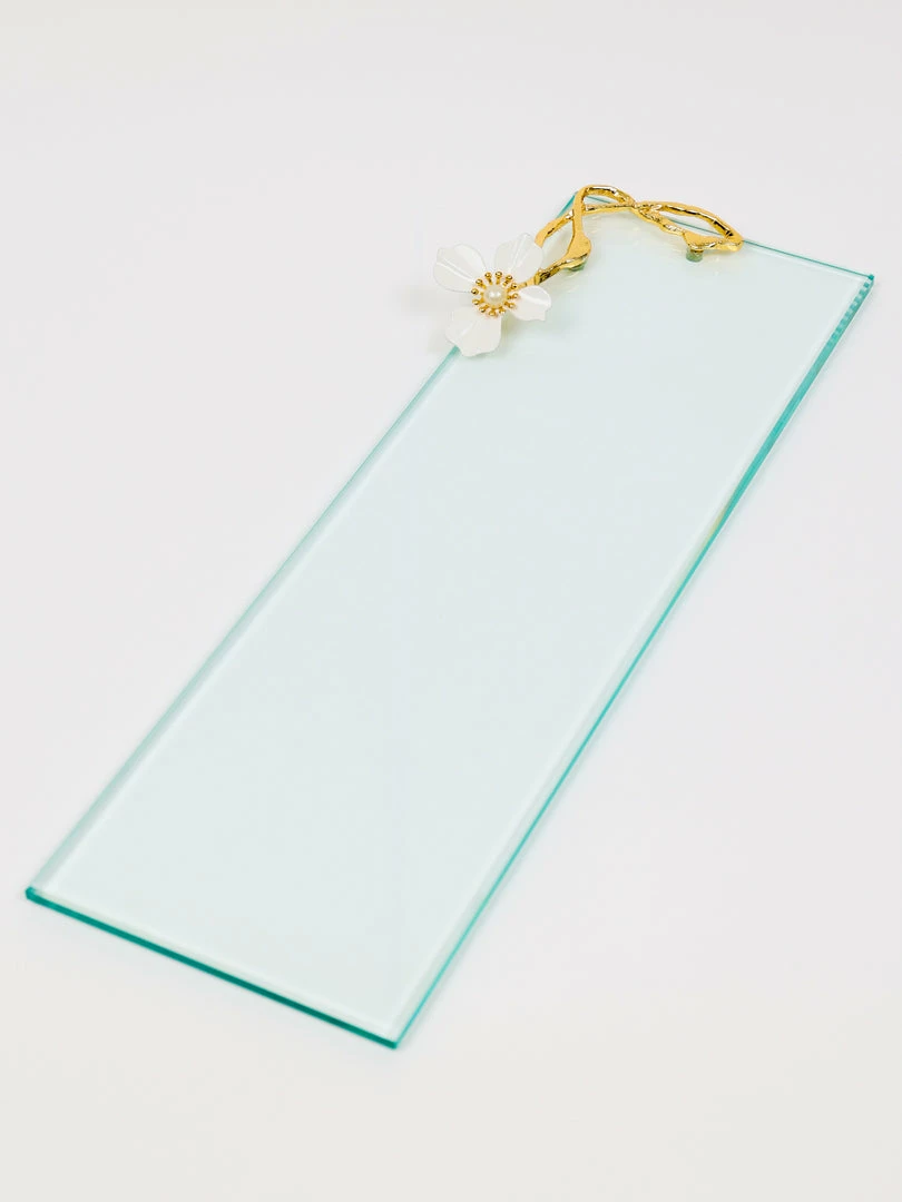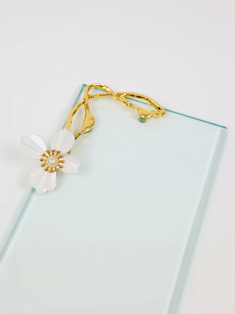 Description: This beautiful rectangular glass tray has stunning gold details with a white jeweled flower design!