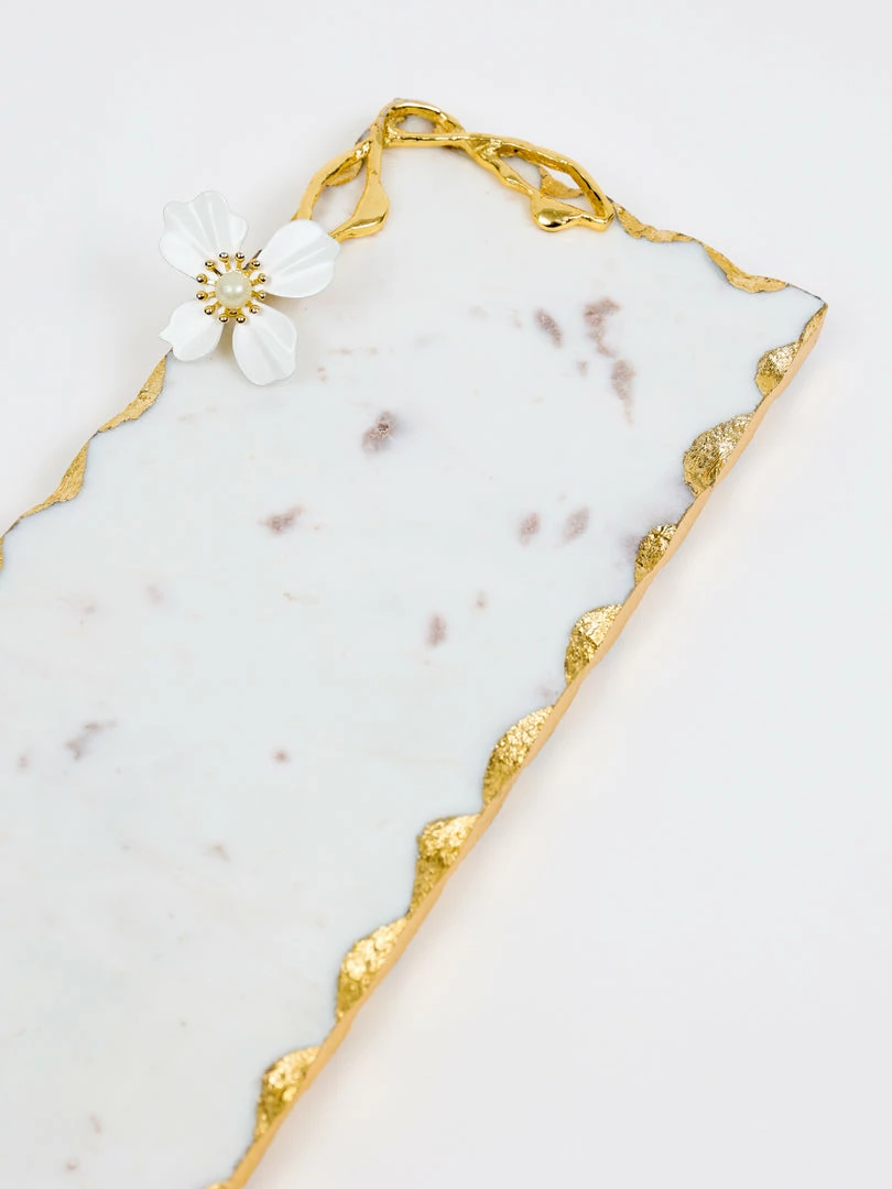 Description: This beautiful rectangular marble tray has stunning gold details with a white jeweled flower design!
