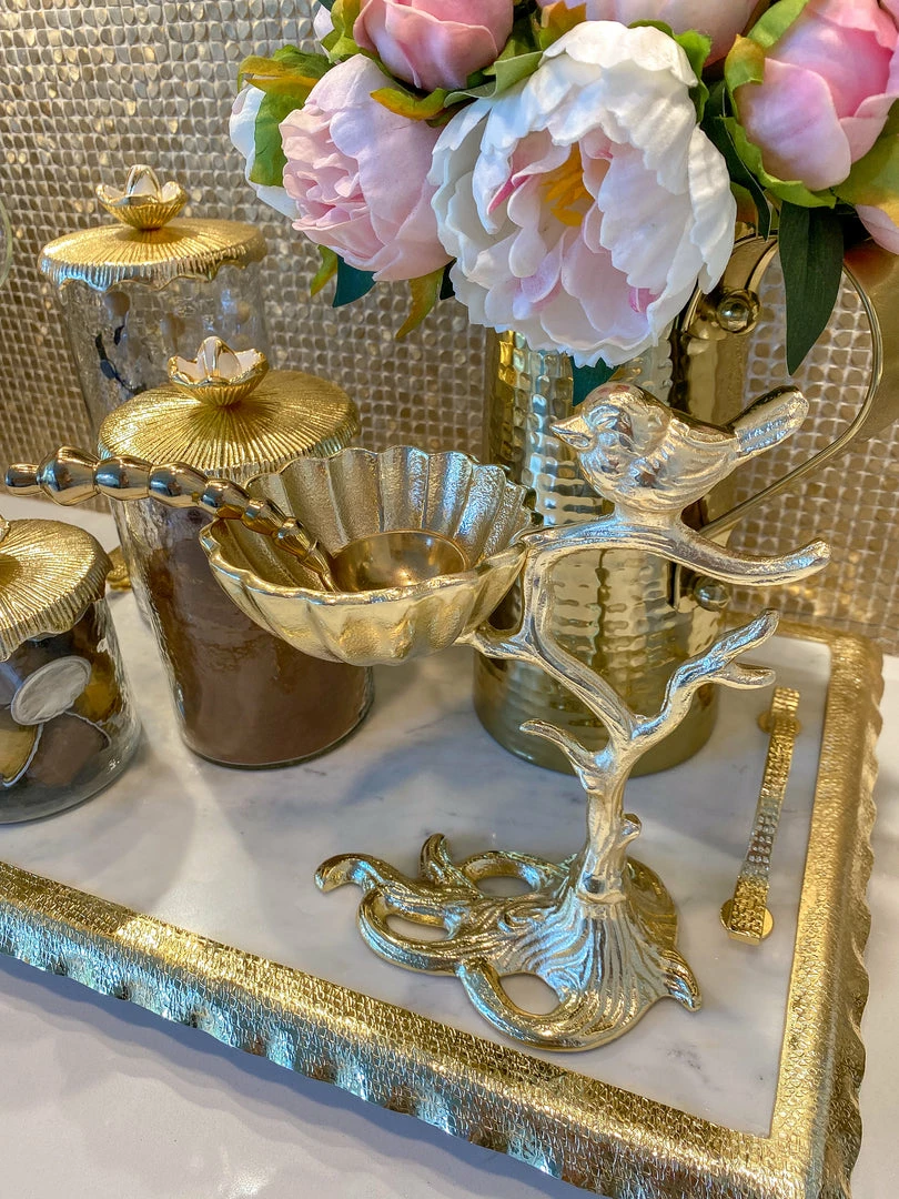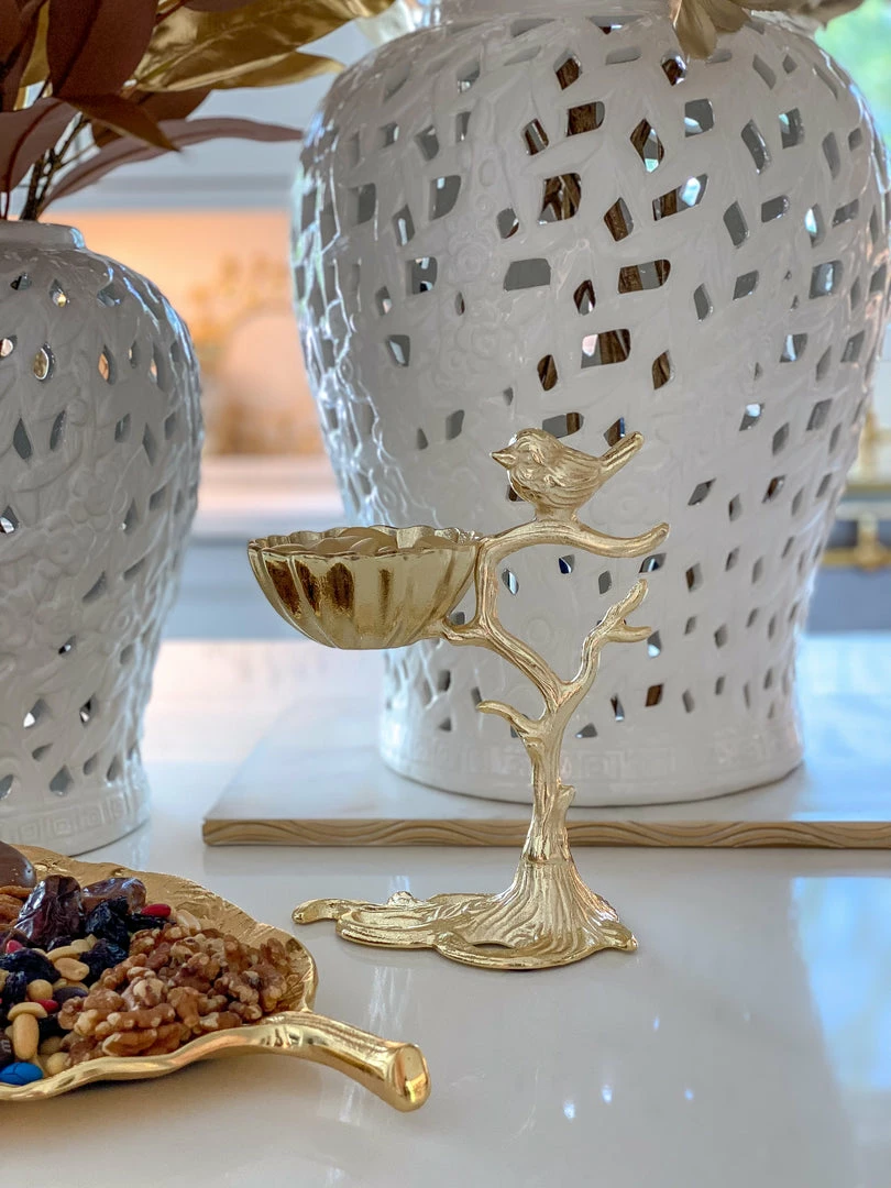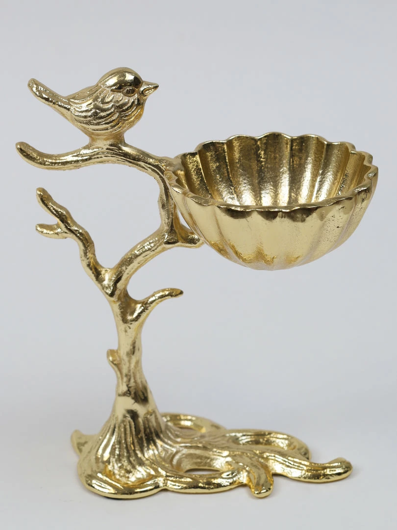 Description: This beautiful decorative snack bowl will enchant your guests! A small bowl sits atop a golden tree, as a little bird waits by your favorite snacks!