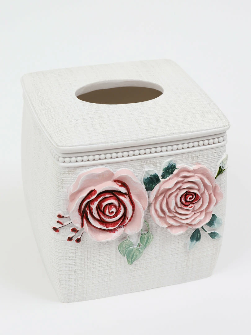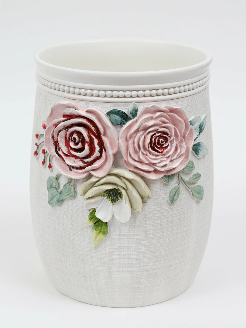 Beautiful bath accessories in hand-painted dimensional resin – the flowers almost come alive – on a textured off-white base. The shower curtain is printed with an oversized floral pattern with the leaves cascading toward the bottom on white background. The rug is tufted in 100% cotton in the shape of a rose in various shades of pink and white and everything coordinates perfectly with the bath, hand, and fingertip embroidered decorative towels.