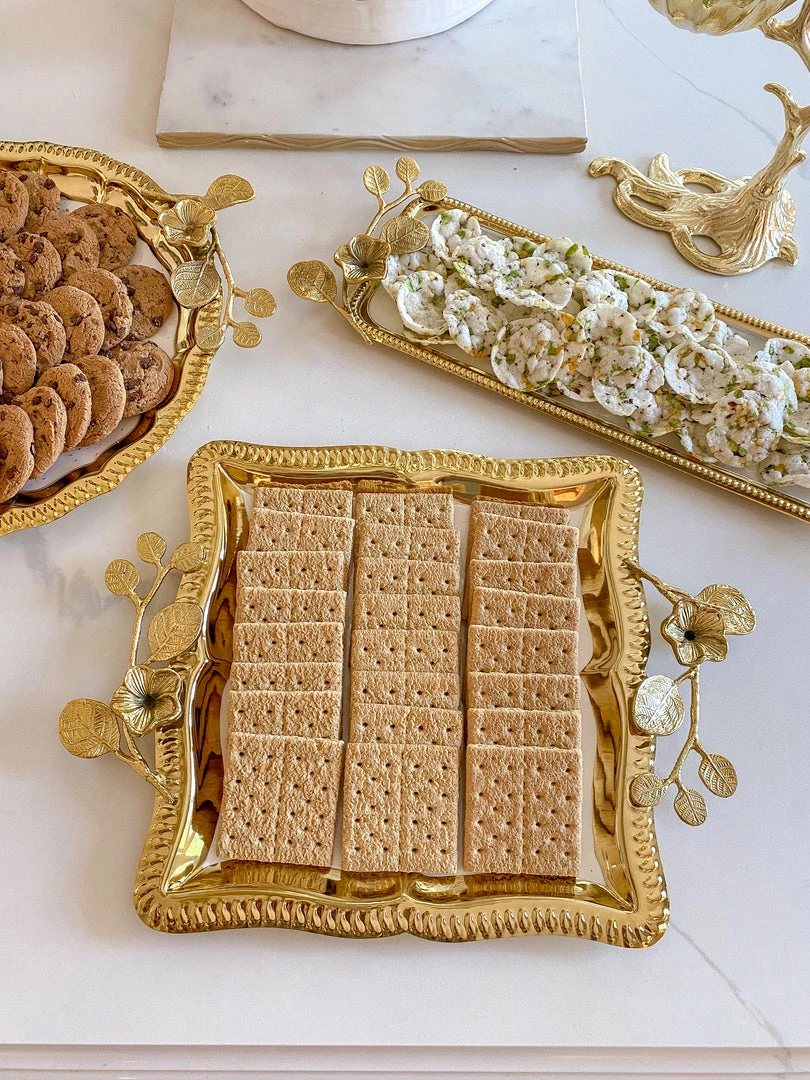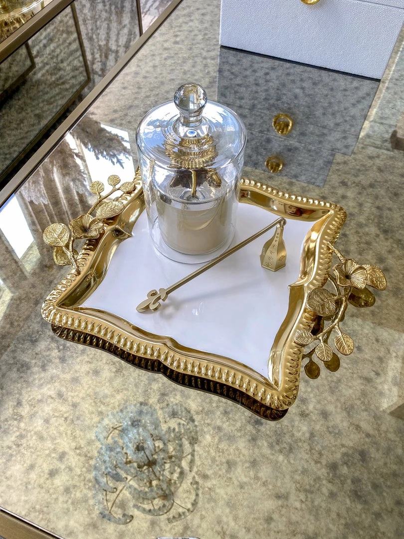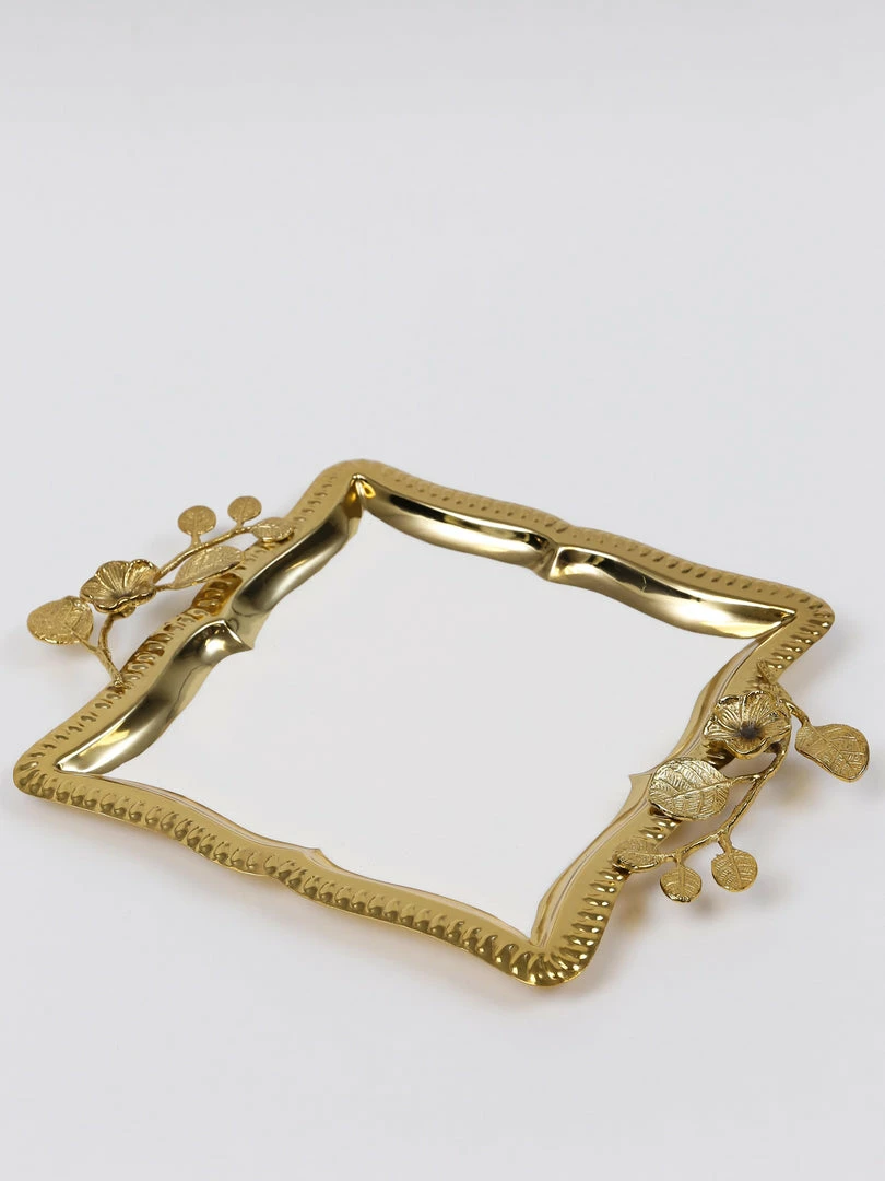 Description: We love the stunning details of this tray! The beautiful gold finish is complimented with a glossy enamel interior for a sleek and modern design. The intricate and detailed floral embellishments make this piece truly unique and stunning! Available in rectangle, round, and square shapes!