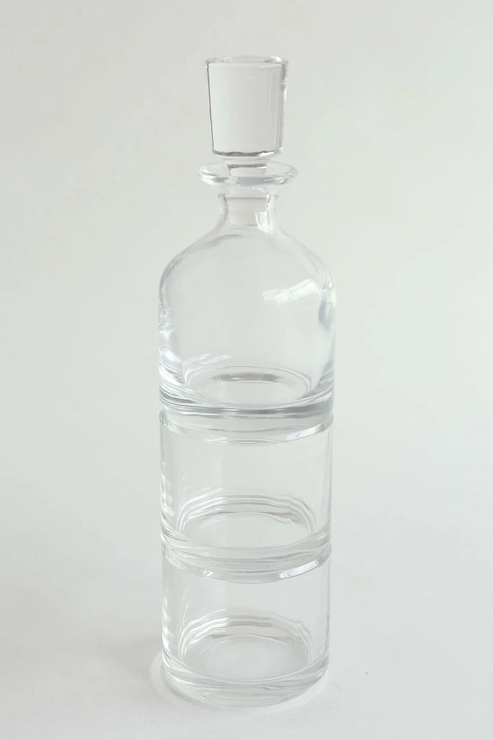 Description: This beautiful glass decanter is a truly unique piece! The decanter is stackable and comes with 2 additional cups! It makes for easy storage and a beautiful design!