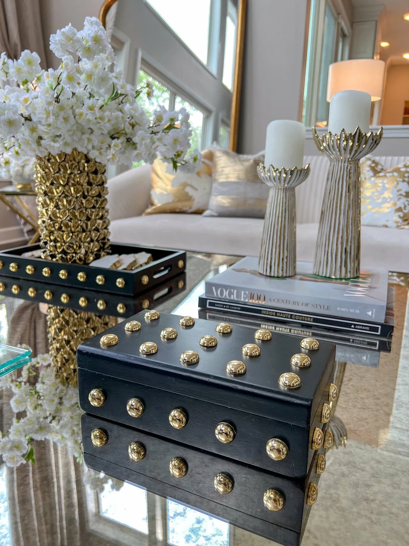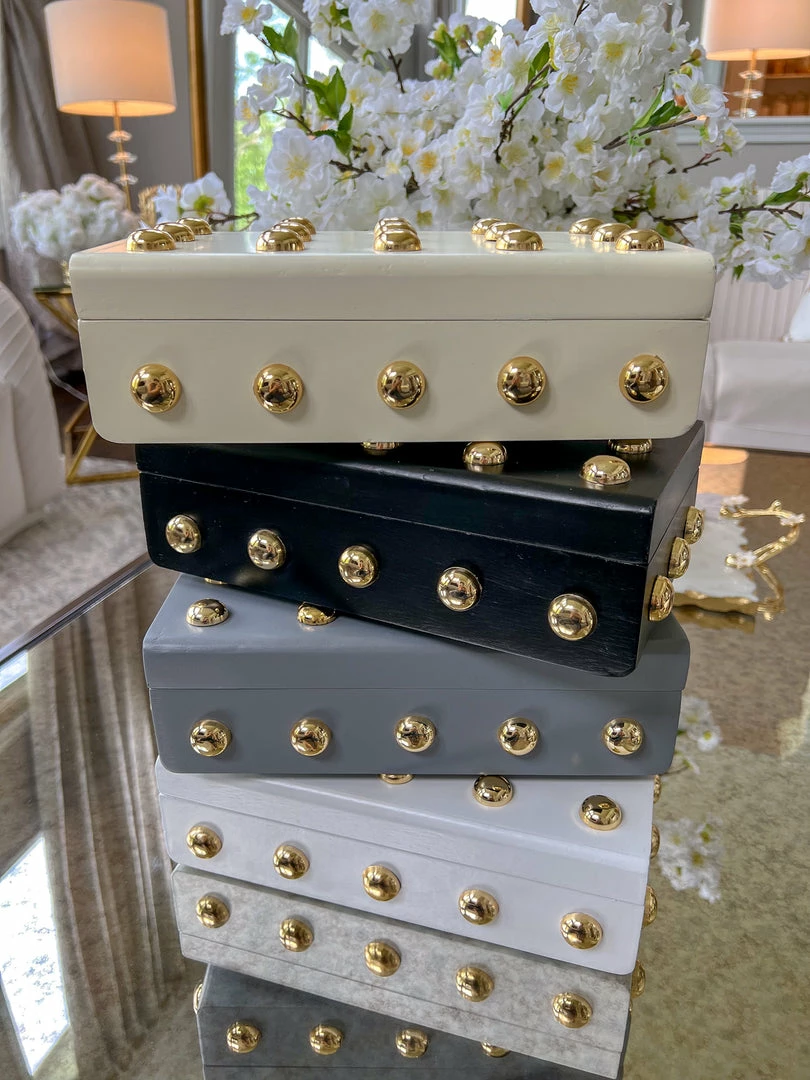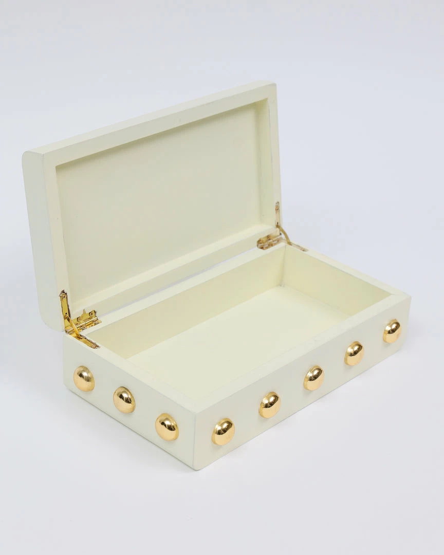 Description: This wooden box with its shiny gold studs is a statement maker.