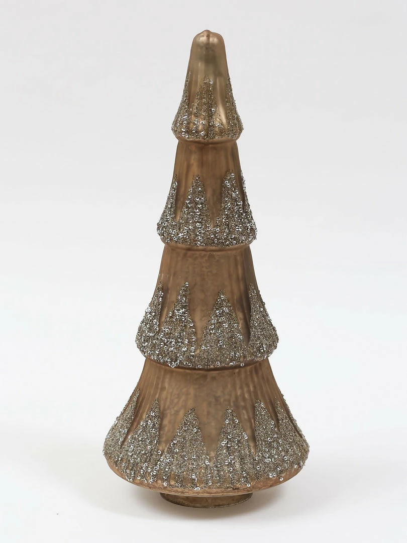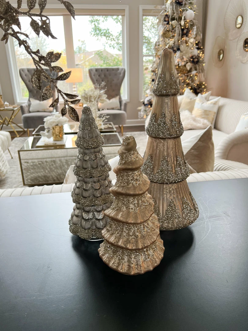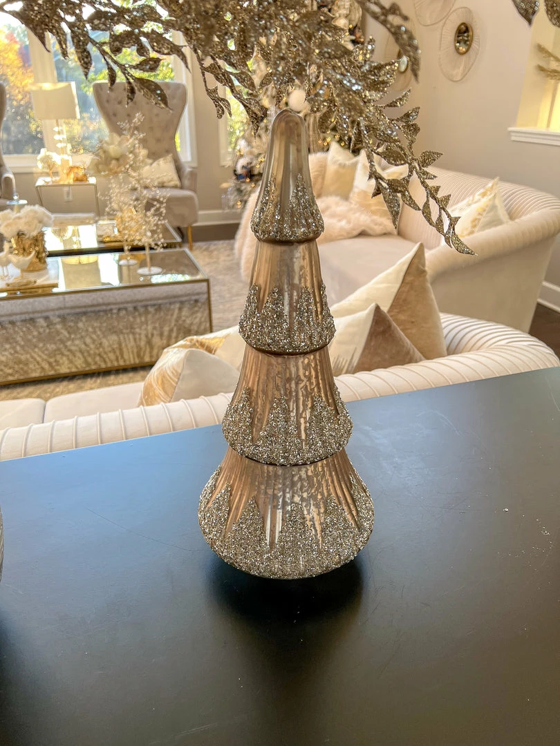 Description: This mercury glass tree with its neutral silver and gold coloring and beautiful glitter finish will instantly elevate any table or shelf as it shimmers in the light effortlessly.